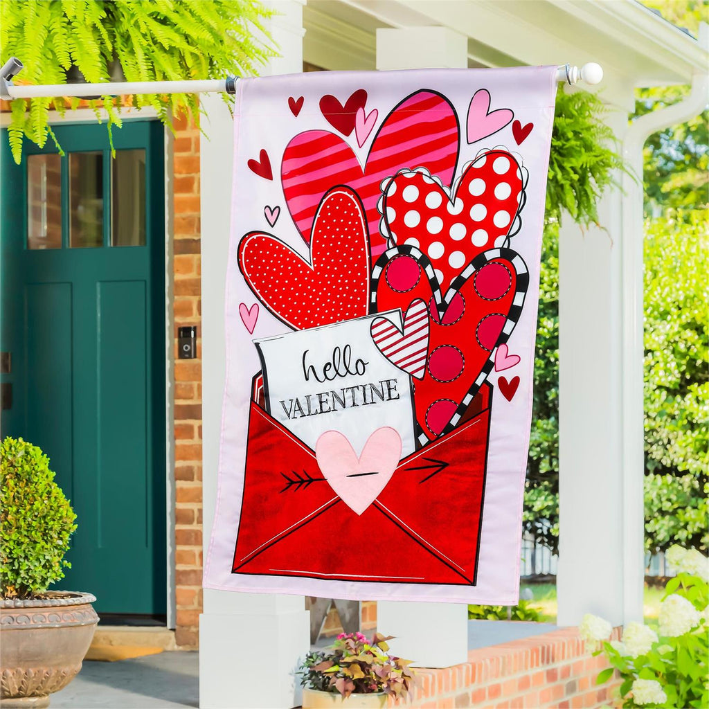 Celebrate love with the Sending Love Valentine's Day Applique House Flag. This vibrant flag features a charming design of hearts and an envelope, perfect for adding a festive touch to your outdoor décor. Crafted with high-quality fabric, this flag is designed to withstand the elements while maintaining its bright colors. Measuring 28 inches in width and 44 inches in height, it fits standard house flag poles. Whether you're decorating for Valentine's Day or simply want to spread love, this flag is an ideal choice.