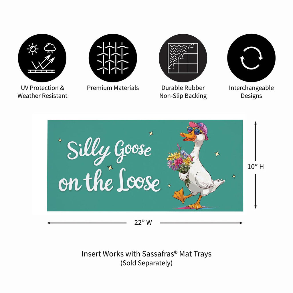 Add a touch of whimsy to your doorstep with the Silly Goose on the Loose Sassafras Switch Mat. This charming insert features a playful goose carrying a bouquet, set against a vibrant teal background. Designed to fit standard Sassafras bases, this mat is perfect for seasonal updates or adding a cheerful note to your entryway. Its durable construction ensures it can handle the traffic of a busy household while maintaining its delightful appearance. Measuring 22 inches by 10 inches, it’s the ideal size for making a statement without overwhelming your space.