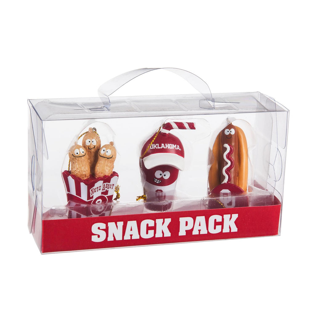 Celebrate your University of Oklahoma pride with this charming Snack Pack ornament set. Featuring three fun and whimsical designs, these ornaments bring a playful touch to your holiday decor. Made with durable materials to last season after season, each piece is a delightful representation of your favorite game-time snacks. Perfect for fans and alumni, these ornaments are a great way to showcase school spirit during the festive season. Compact and lightweight, they are easy to hang on any tree or display as a decorative accent.