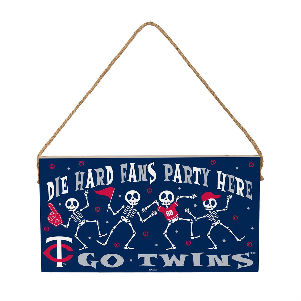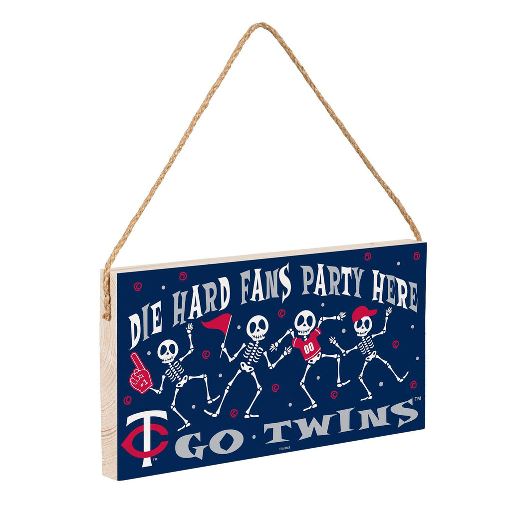 Celebrate your love for the Minnesota Twins this Halloween with this spirited wood wall sign. Perfect for fans who want to add a festive touch to their home, this 6x11 inch sign features dancing skeletons in team gear. Crafted from durable wood, it comes with a rope for easy hanging, making it a fun and functional addition to any room or party décor. The bold design and playful theme make it a standout piece for the fall season, showcasing your team pride in style.