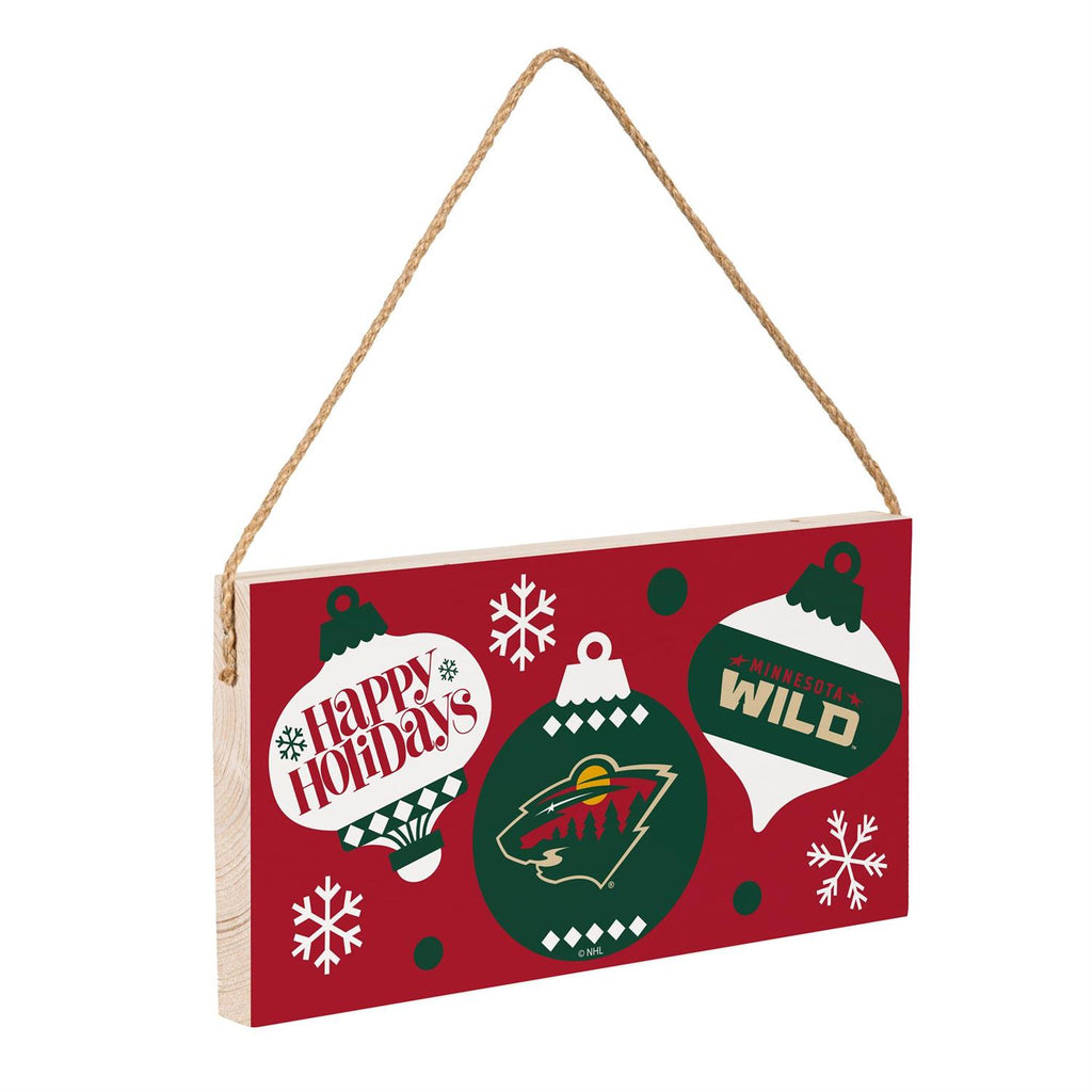 Celebrate the holiday season with the Minnesota Wild Holiday Wood Wall Sign, a perfect addition to any fan's home décor. Measuring 6x11 inches, this festive sign features vibrant team colors and holiday-themed graphics, including snowflakes and ornaments. Crafted from durable wood, it comes with a natural rope for easy hanging. Whether displayed in the living room or the entryway, this sign adds a touch of team spirit to your holiday celebrations.