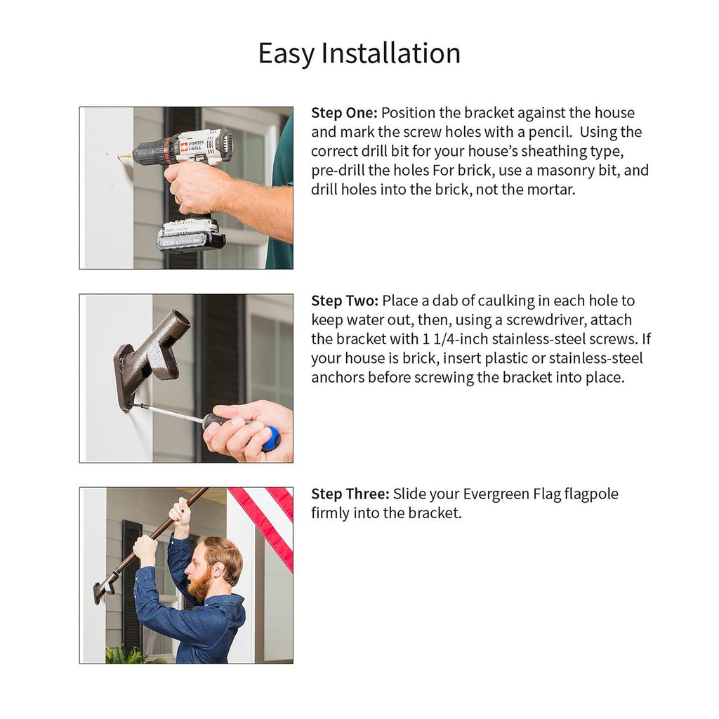 Easy to install, you can fly your flag wherever you'd like with the help of this adjustable pole bracket. Crafted from cast iron with a sleek bronze look, the two-position bracket, formed by casting, can be used as a wall mount or pole for house and estate flags. Choose between two different positions: 45-degree angle or 90-degree angle. Mounting screws are included. The hardware is powder-coated with a weather-resistant finish to ensure long-lasting use.