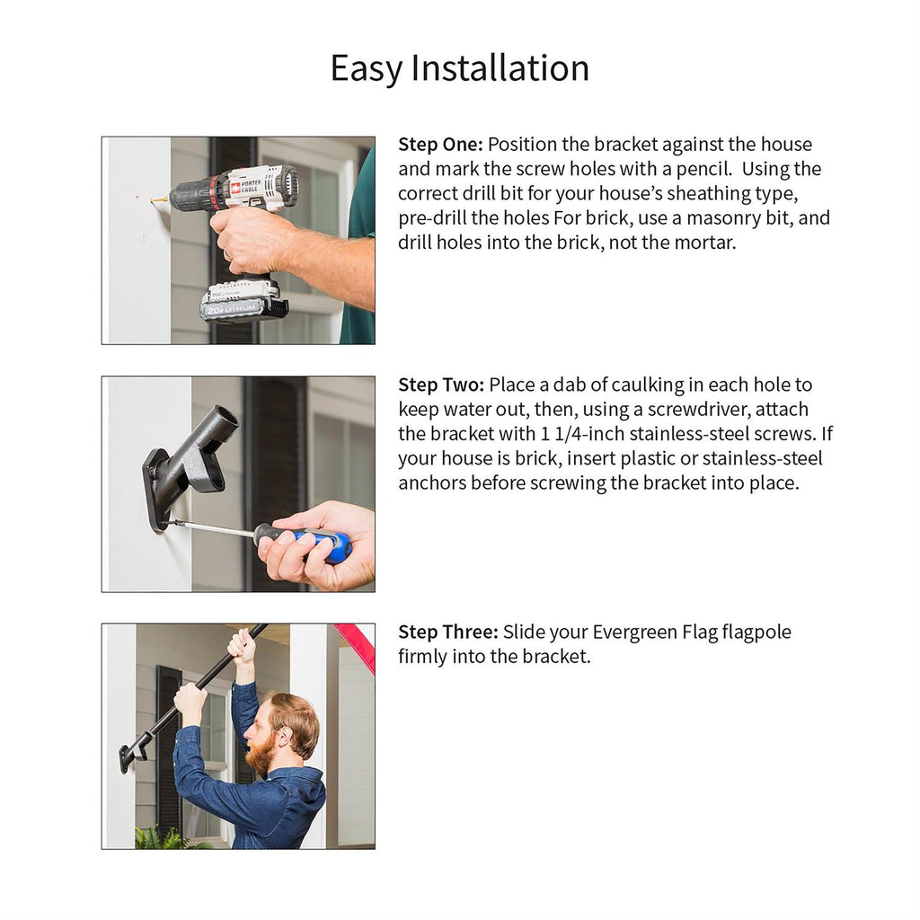 Easy to install, you can fly your flag wherever you'd like with the help of this adjustable pole bracket. Crafted from cast iron with a sleek black look, the two-position bracket, formed by casting, can be used as a wall mount or pole for house and estate flags. Choose between two different positions: 45-degree angle or 90-degree angle. Mounting screws are included. The hardware is powder-coated with a weather-resistant finish to ensure long-lasting use.