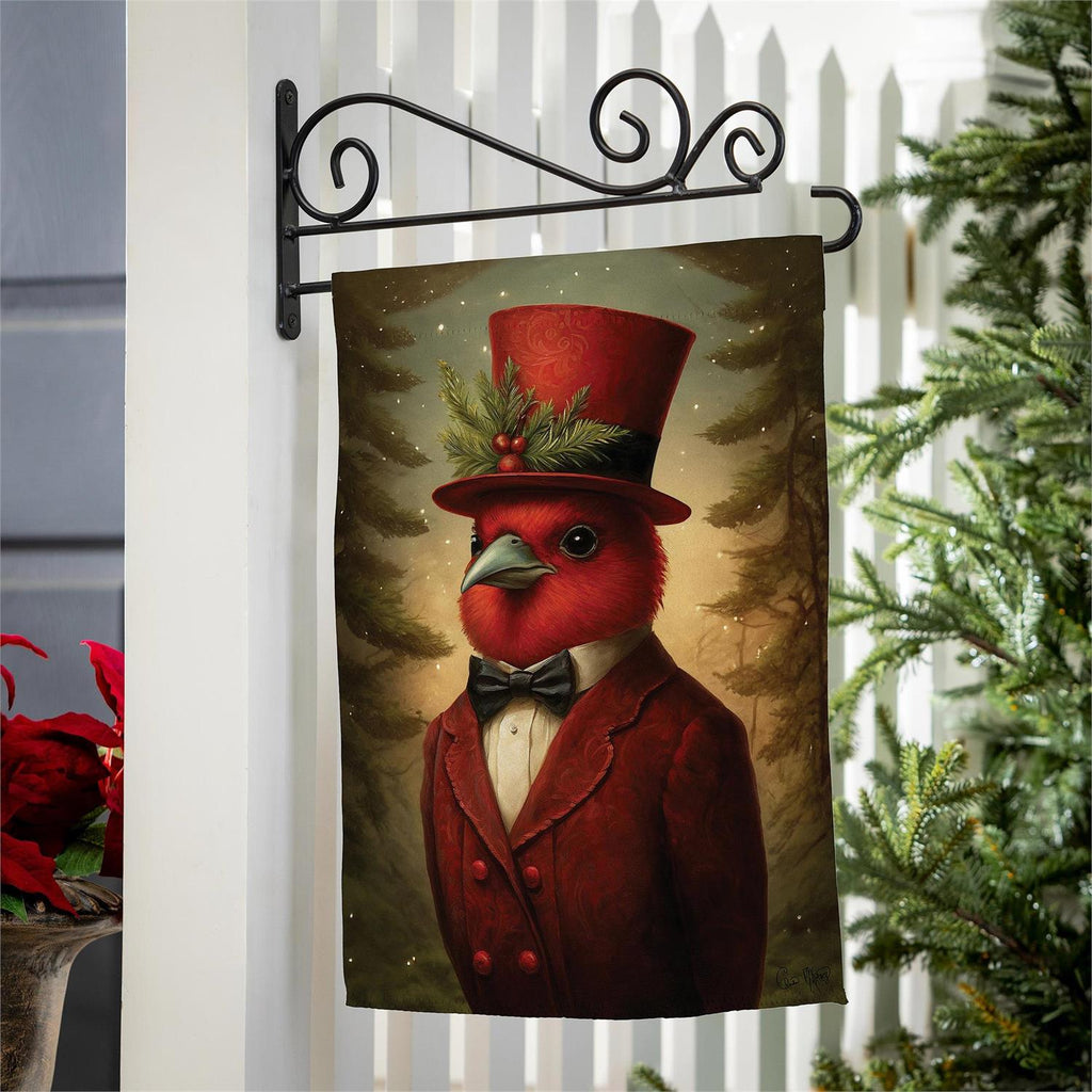 Add a touch of whimsy to your garden with the Sir Cardinal Suede Garden Flag. This charming flag features an elegantly dressed cardinal, complete with a festive top hat and bow tie, set against a serene winter backdrop. Made from durable suede, this flag is designed to withstand the elements while maintaining its vibrant colors. Perfect for adding personality to your outdoor space during the holiday season or any time of year. Measuring 12.5 inches wide by 18 inches high, it's an ideal size for any garden or entryway.