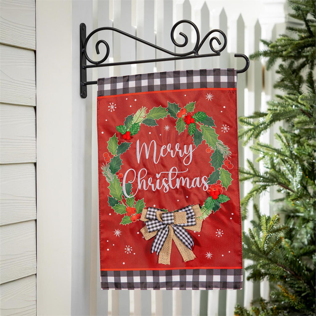 Celebrate the holiday season with this charming Merry Christmas Wreath Applique Garden Flag. Measuring 12.5 x 18 inches, it's perfectly sized to add a festive touch to your outdoor space. The vibrant red backdrop, accented with a classic Christmas wreath, combines holly leaves and berries, creating a warm and welcoming atmosphere. A checkered bow adds a rustic flair, while the high-quality applique design ensures durability and vibrant colors. Ideal for gardens, porches, or entryways, this flag is a delightful way to greet guests and spread holiday cheer.