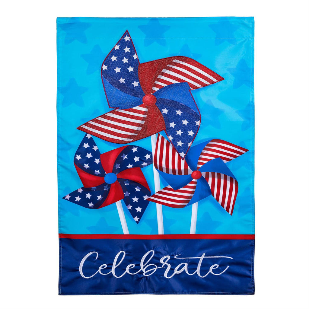 Add a festive touch to your outdoor decor with the Celebrate Pinwheel Applique House Flag. Measuring 28 inches wide by 44 inches high, this vibrant flag features red, white, and blue pinwheels set against a bright blue background. The applique design offers a dimensional look, perfect for celebrating patriotic occasions and holidays. Crafted from durable, weather-resistant materials, it's designed to withstand the elements while maintaining its vivid colors. Whether for Independence Day, Memorial Day, or simply to show your patriotic spirit, this flag makes a cheerful addition to any home.