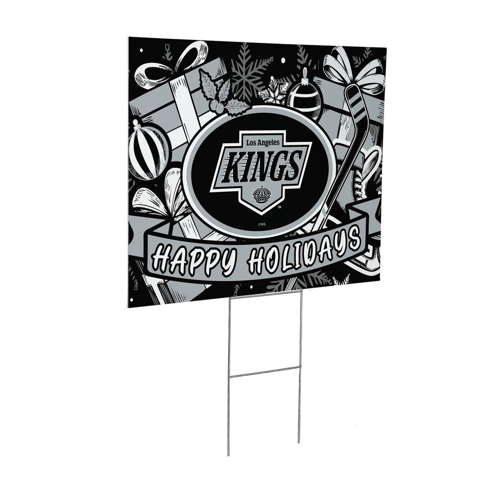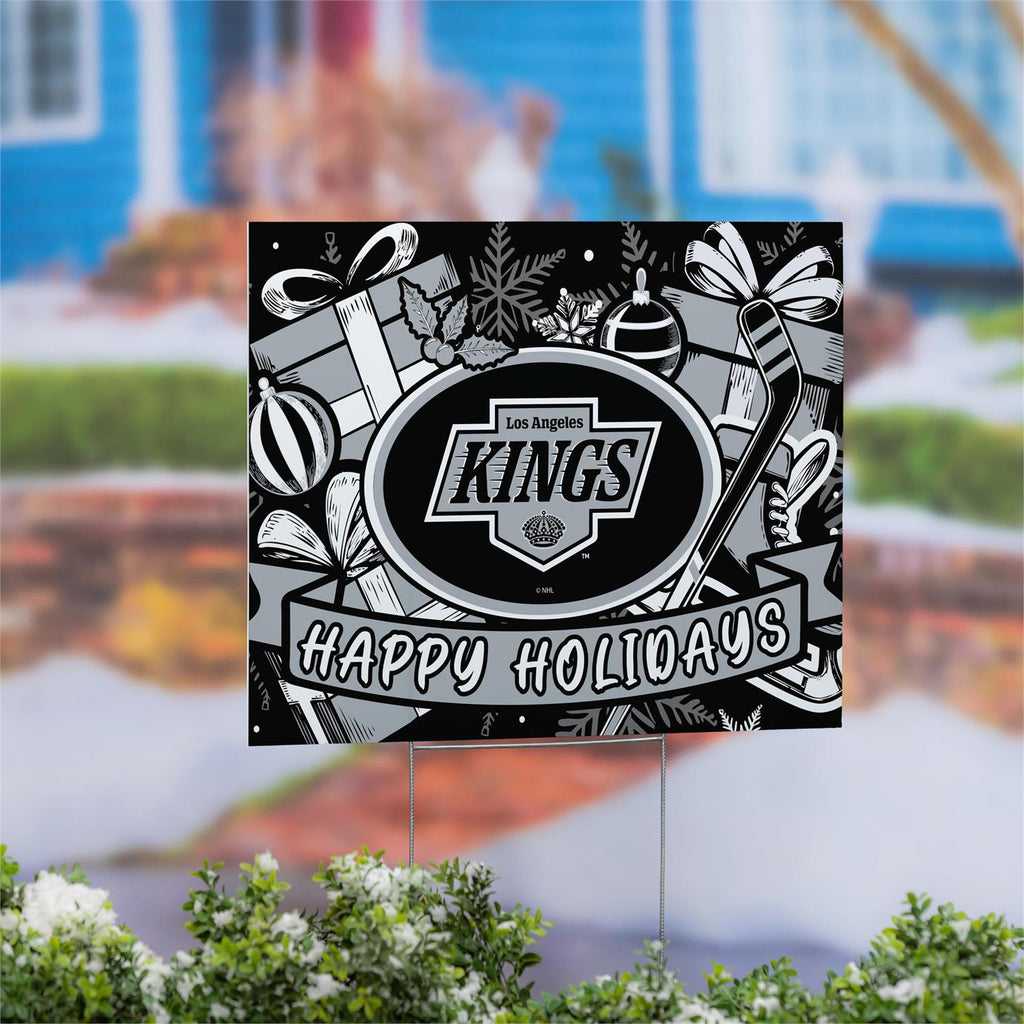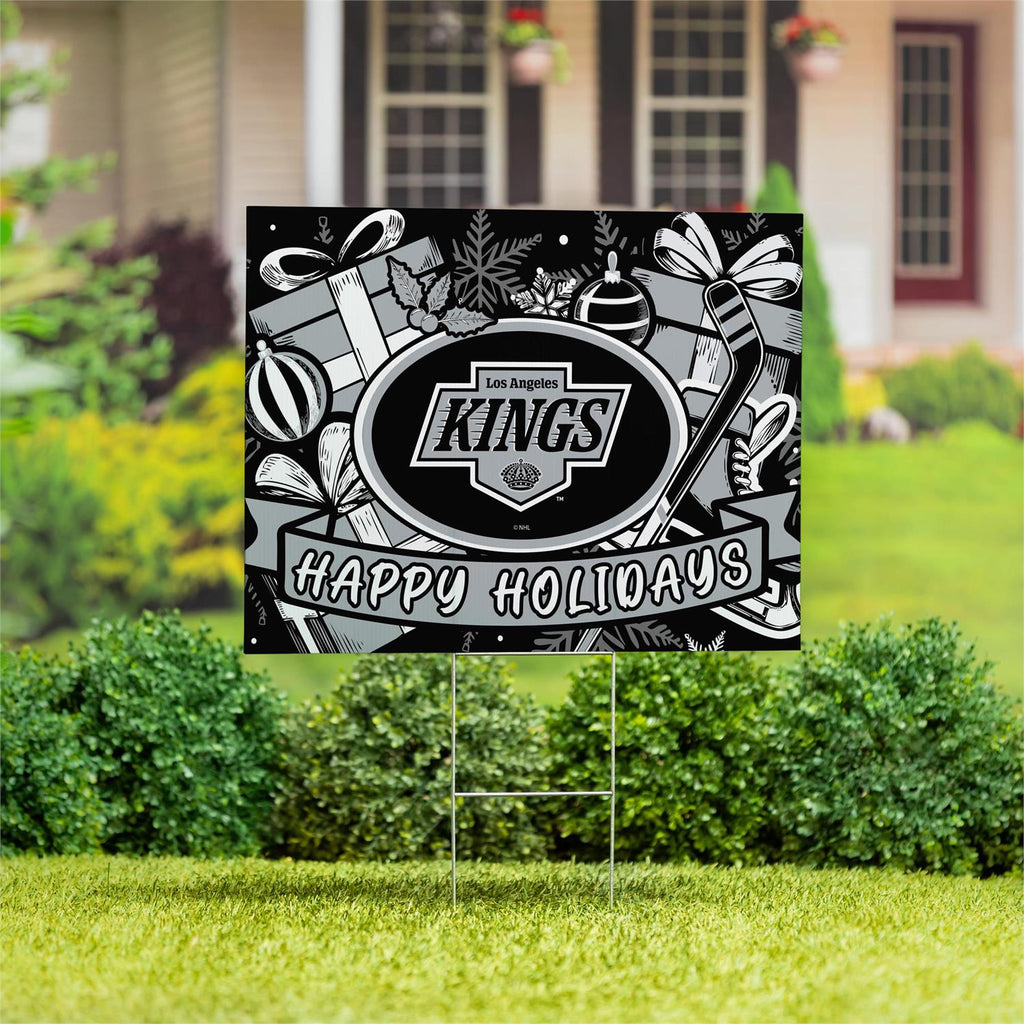 Celebrate the holiday season with a touch of team spirit using this Los Angeles Kings Yard Sign. Perfect for the garden or front yard, this festive sign features a holiday-themed design complete with ornaments and gifts, along with the iconic Los Angeles Kings logo. Measuring 24 inches in length and 18 inches in width, it's an ideal size to make a statement without overwhelming your outdoor space. The sign is crafted for durability and easy installation, making it a hassle-free way to show off your team pride during the festive season.