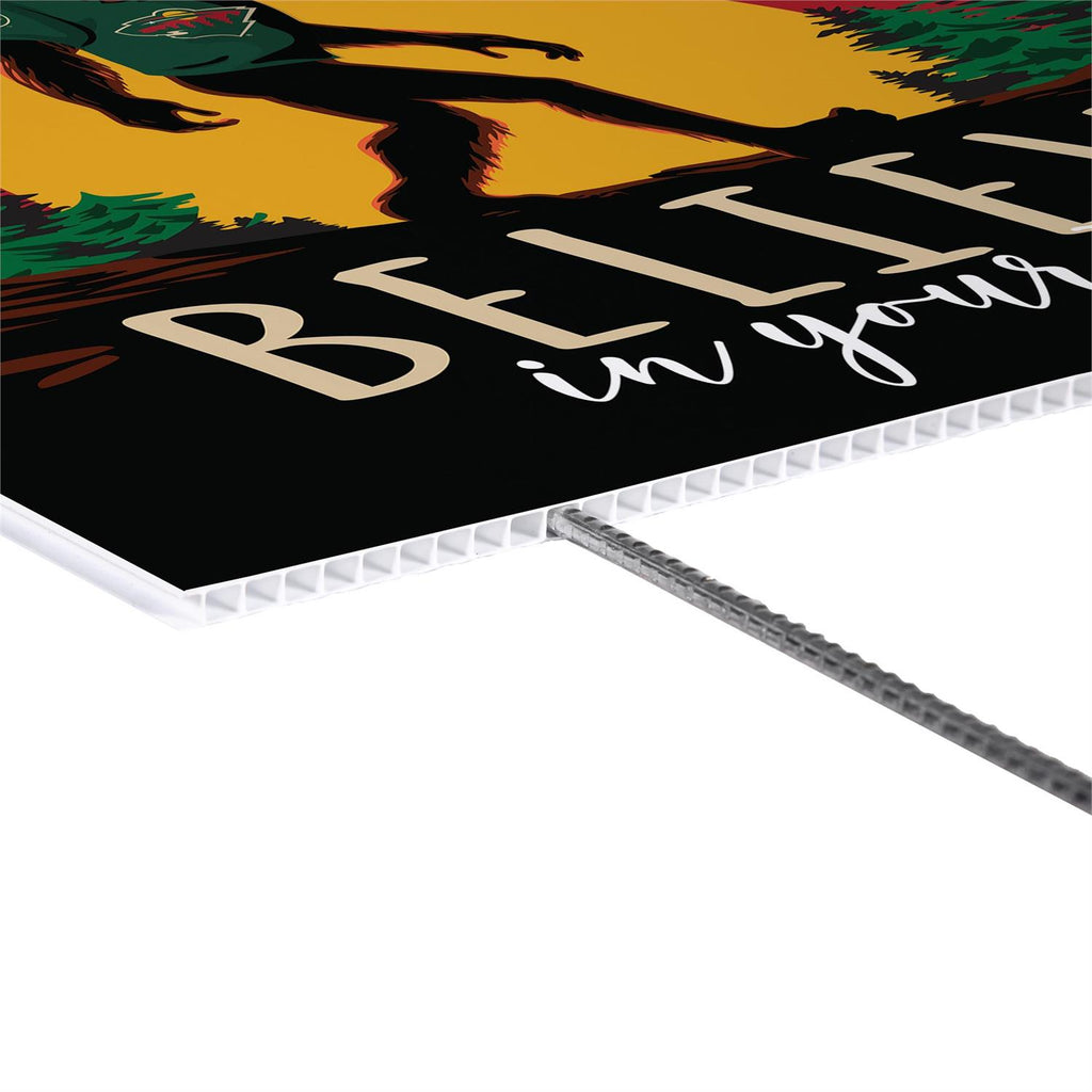 Show your support for the Minnesota Wild with this unique Bigfoot yard sign. Measuring 24 inches in length and 18 inches in width, this sign is perfect for any garden or outdoor space. The vibrant design features a silhouette of Bigfoot against a sunset backdrop, encouraging everyone to "Believe in your team." Made from durable materials, it's weather-resistant and ideal for year-round display. Whether you're a die-hard fan or looking to add some personality to your garden, this sign is a perfect choice.