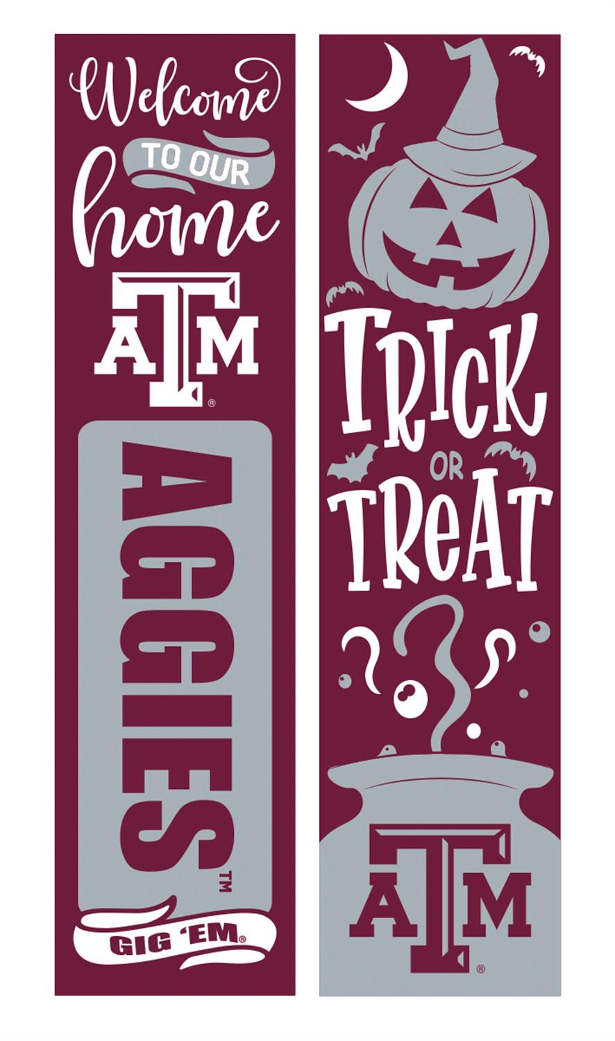 Elevate your porch décor with this 46" Double Sided Leaner featuring Texas A&M spirit and Halloween charm. Designed to make a festive statement, this leaner showcases a "Trick or Treat" design with playful Halloween elements on one side, perfect for welcoming trick-or-treaters. The other side proudly displays the Texas A&M logo, allowing you to show your school pride year-round. Made with durable materials, this leaner is built to withstand outdoor conditions. Its slim profile makes it an easy fit in any porch setting, adding seasonal style without taking up much space.