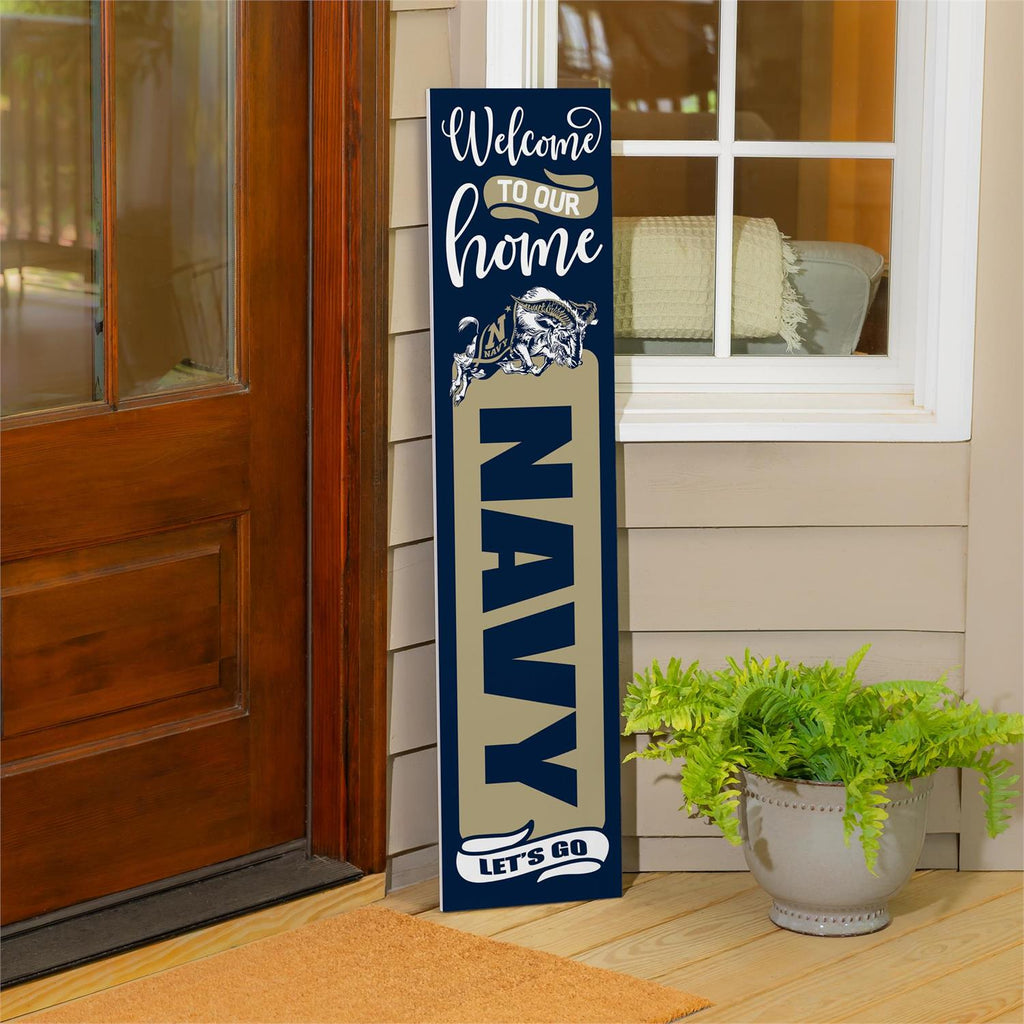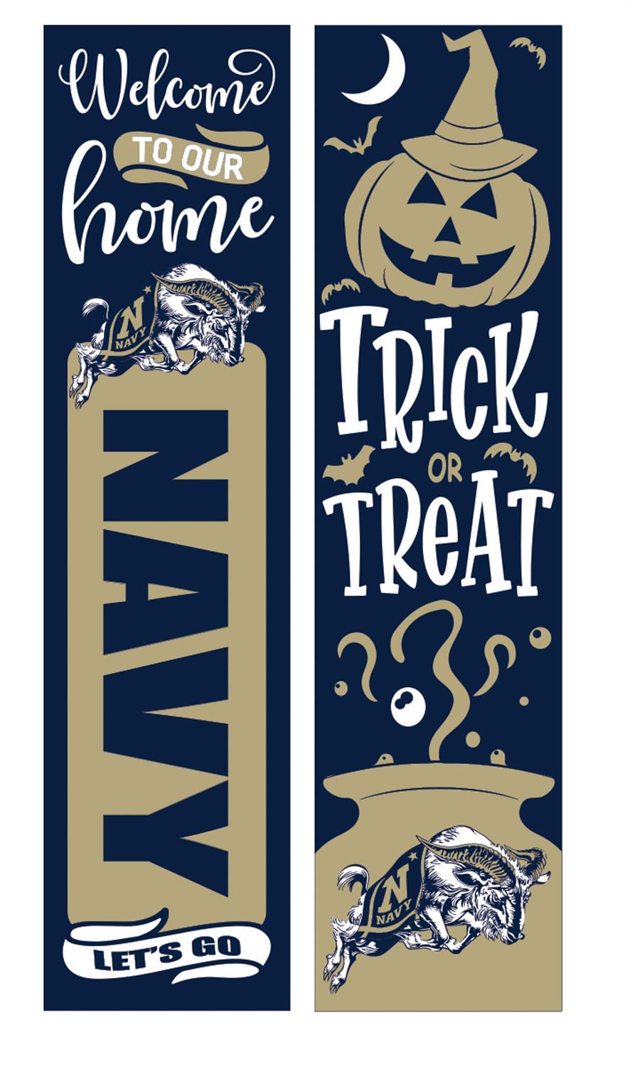 Celebrate your support for the US Naval Academy while embracing the Halloween spirit with this 46-inch double-sided porch leaner. Perfect for displaying on your front porch, this sign features a welcoming message on one side and a festive Halloween design on the other, making it versatile for seasonal decoration. Crafted from durable materials, it withstands outdoor elements, ensuring long-lasting use. The slim design allows it to fit neatly against your entryway, adding a touch of personalized charm to your home decor. Show off your Navy pride and seasonal flair with this eye-catching piece.