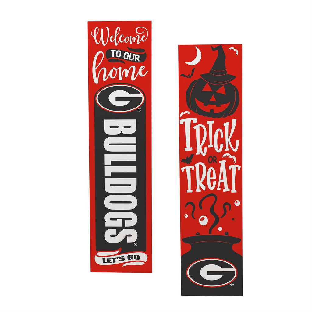 Celebrate your team spirit with this 46" Double Sided Leaner featuring the University of Georgia. Perfect for Halloween and beyond, this porch leaner showcases vibrant graphics and a spirited design that welcomes guests while showing off your Bulldogs pride. Made for durability, it is suited for both indoor and outdoor use, adding a festive touch to any porch or entryway. The double-sided feature offers versatile display options, making it a practical addition to your home décor. With its bold colors and collegiate theme, this leaner stands as a proud statement piece for fans.