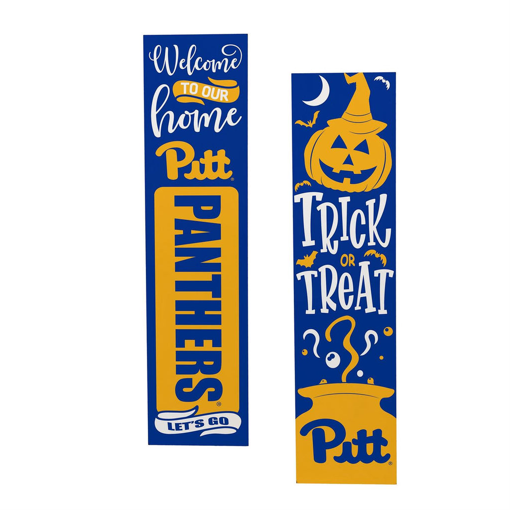 Celebrate Halloween and show off your school spirit with this 46" double-sided leaner featuring the University of Pittsburgh theme. Perfect for adding a festive touch to your porch, this porch leaner showcases vibrant blue and gold colors, and playful imagery like a jack-o'-lantern and a witch’s hat. Made from durable materials, it’s designed to withstand the elements, ensuring that your Halloween decor remains eye-catching throughout the season. Whether you're welcoming trick-or-treaters or simply celebrating your favorite team, this leaner is a delightful addition to any home.