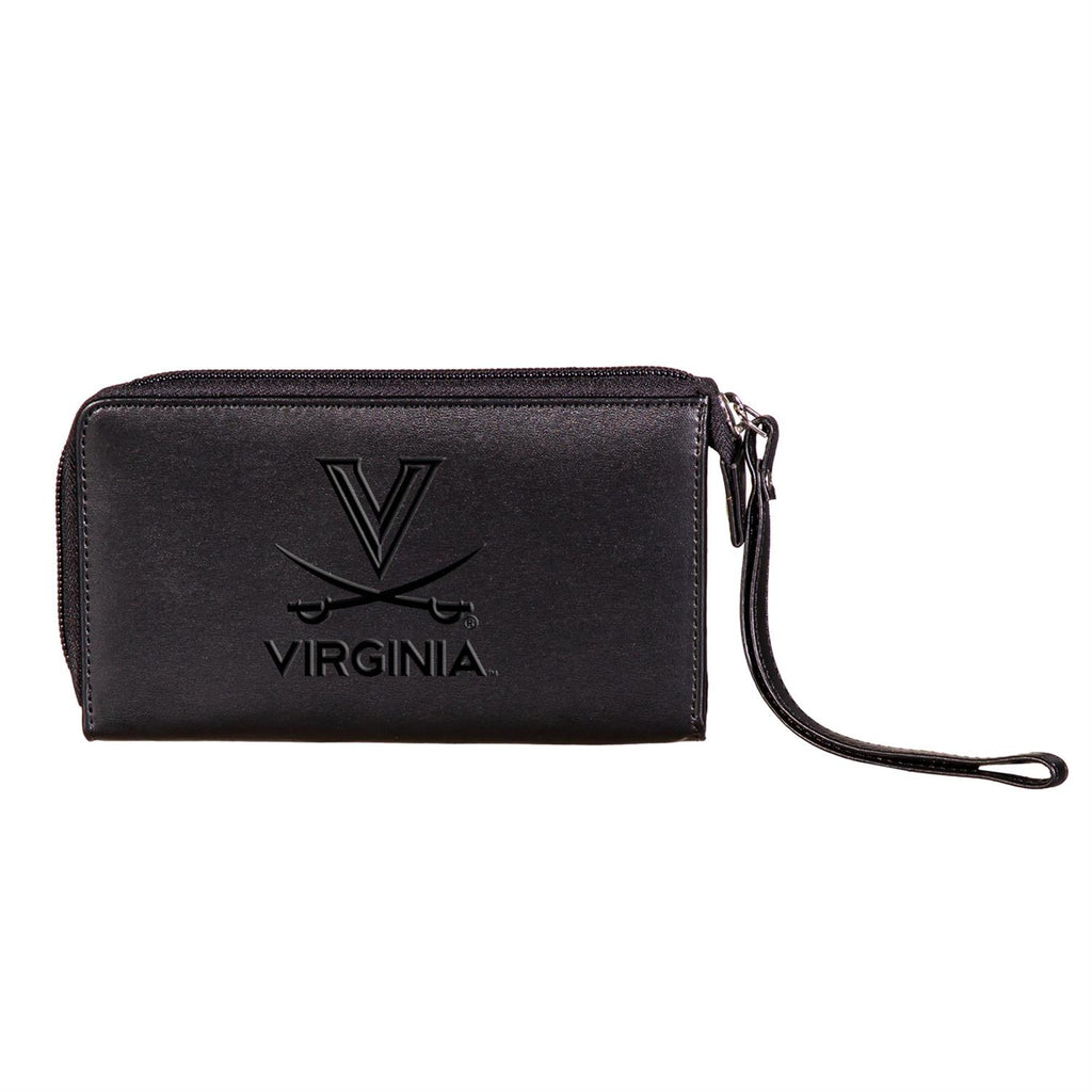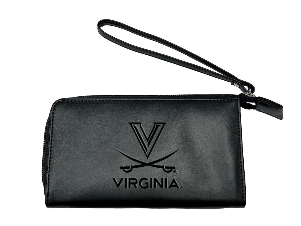 Showcase your school pride with this sleek University of Virginia wristlet wallet. Crafted from high-quality vegan leather, it offers a sophisticated way to keep your essentials organized. The compact design features a secure zip closure and an interior spacious enough for your cards, cash, and a phone up to 6.5 inches. With an embossed logo, it’s perfect for students, alumni, or fans looking to make a subtle statement. The detachable wrist strap provides versatility and convenience, making it ideal for game days or everyday use.