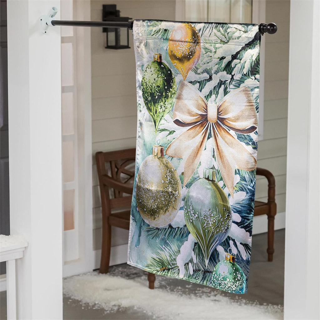 Elevate your home's holiday spirit with this Flocked Green & Gold Ornaments Lustre House Flag. Featuring a stunning design of golden and green ornaments with a luxurious bow, this flag brings festive elegance to your outdoor décor. The high-quality lustre finish ensures vibrant colors and durability, making it a perfect addition for the winter season. At 43 inches wide and 29 inches high, it provides a welcoming display for any porch or garden. Transform your space into a winter wonderland with this charming seasonal accent.