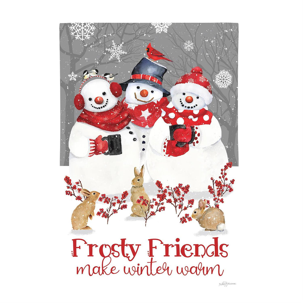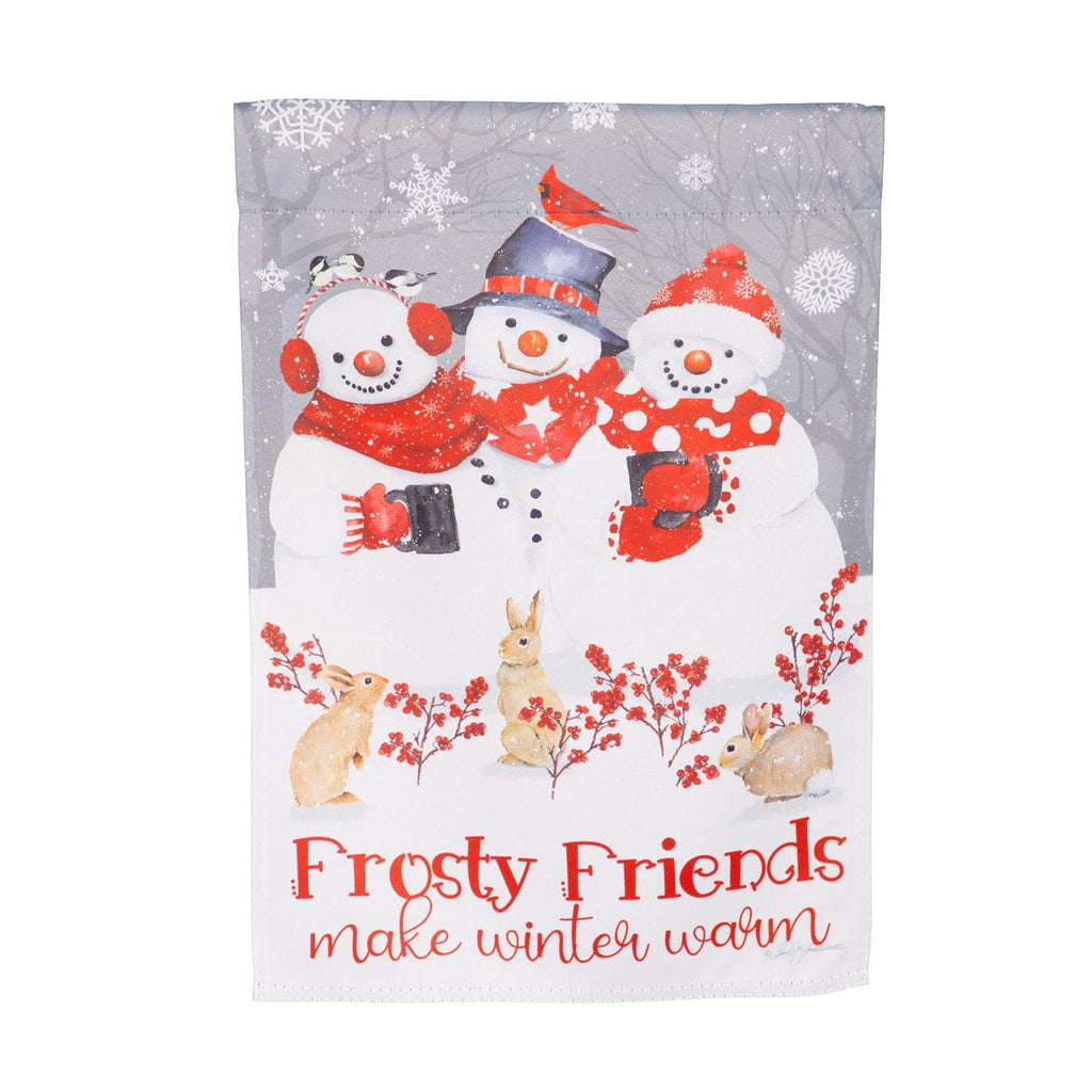 Decorate for the season and welcome friends and family to the home with this suede house flag. It features three friendly snowmen decked out in red hats and scarves and surrounded by falling snow. Artwork is heat transferred onto the sun-blocking material so that it is easily viewed from both sides. The weatherproof poly-suede will not fray or fade with continued outdoor use. This flag features a sleeve for use with any standard flagpole or stand, sold separately.