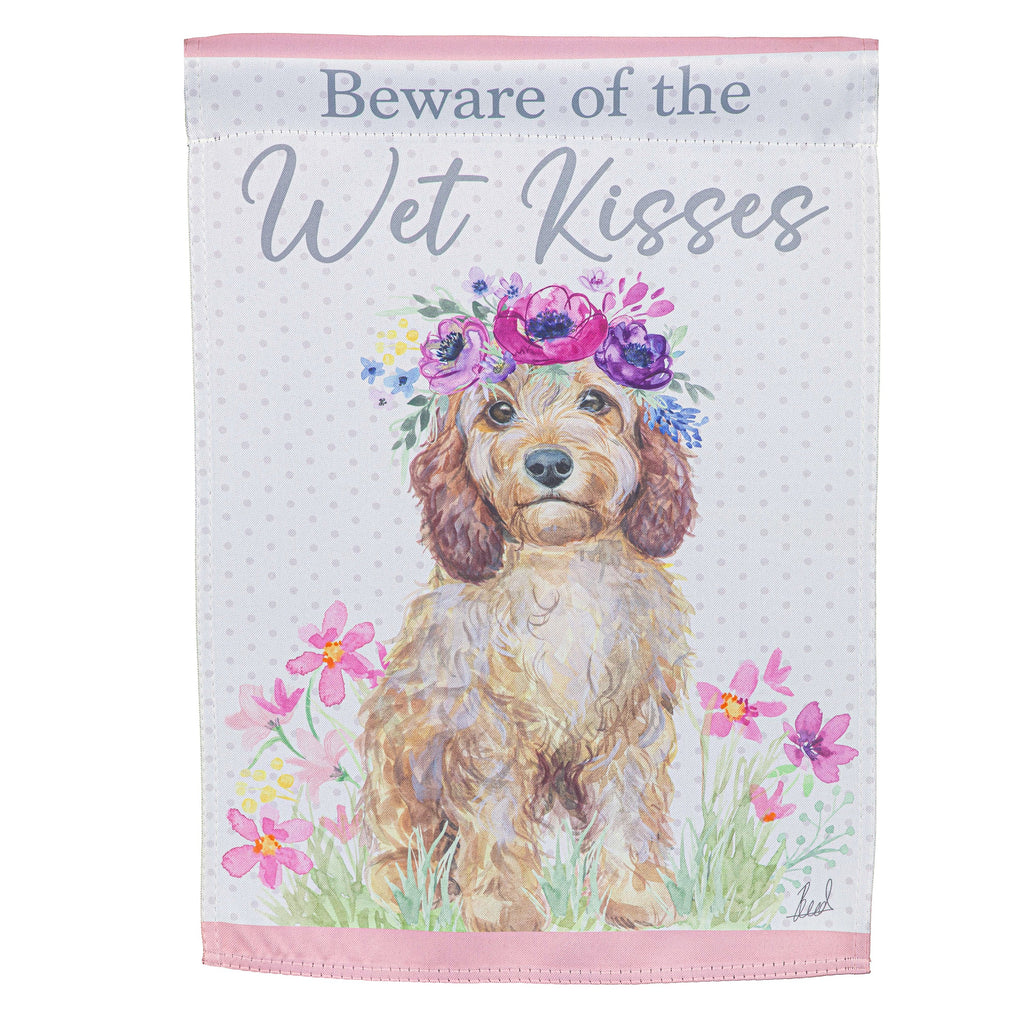 Welcome visitors with this charming suede garden flag featuring a delightful dog and floral design. Perfect for adding a touch of whimsy to your outdoor space.