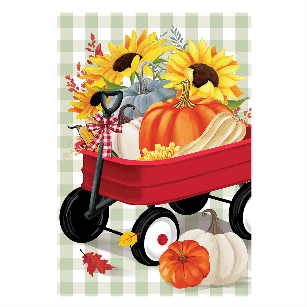 Celebrate the autumn season with this charming Wagon Filled Pumpkin Suede Garden Flag. Perfect for adding a touch of fall festivity to your outdoor space, this flag features a delightful design of bright sunflowers and colorful pumpkins nestled in a classic red wagon. Made from durable suede, it offers vibrant colors and a soft texture, ensuring it remains a standout piece in your garden or yard. Measuring 12.5 x 18 inches, it's the ideal size for showcasing on a garden flag stand, bringing warmth and charm to your home exterior.