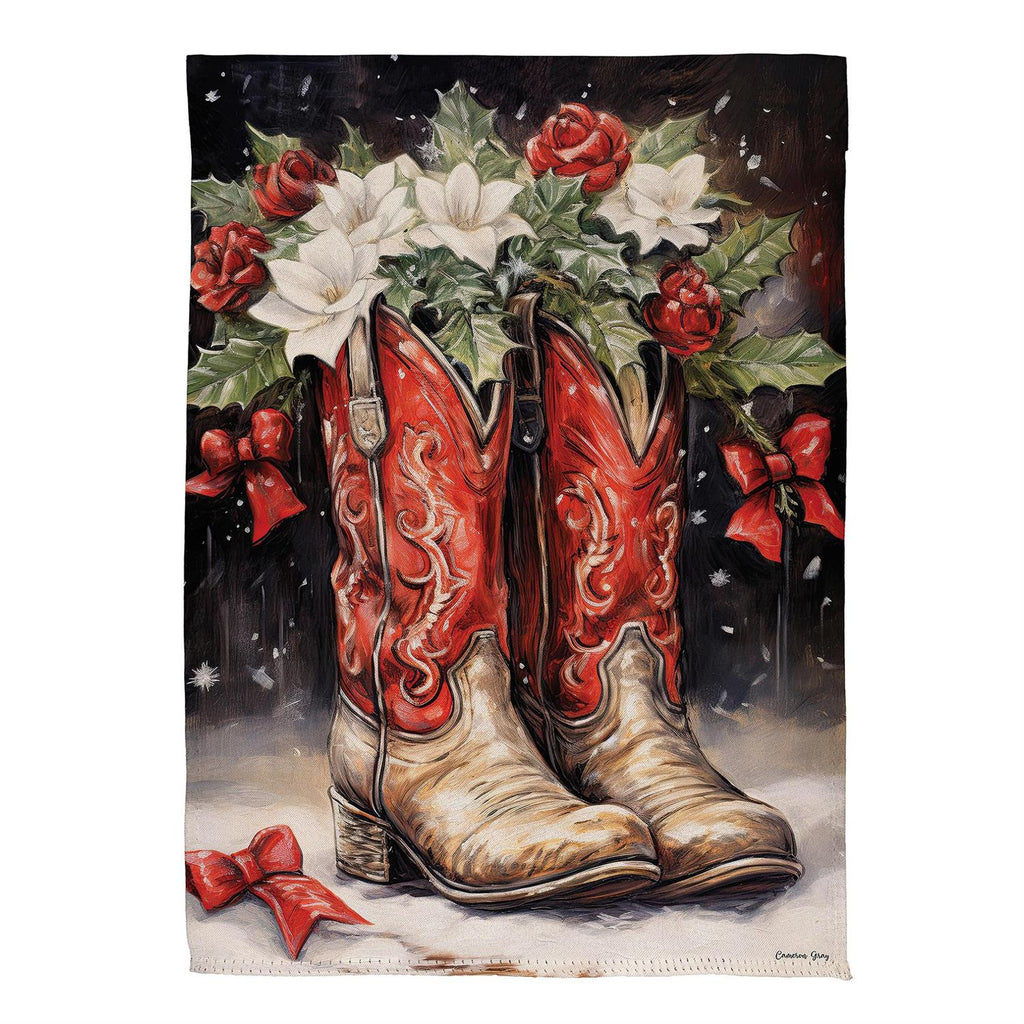 Celebrate the holiday season with a rustic flair using this Red Christmas Cowboy Boots Suede Garden Flag. Perfect for adding a touch of Western charm to your outdoor décor, this flag features beautifully detailed red cowboy boots filled with festive poinsettias and holly against a wintery backdrop. Crafted from high-quality suede, the flag is designed to withstand the elements while maintaining its vibrant colors. Measuring 12.5 inches by 18 inches, it's the ideal size for gardens, porches, or pathways. Welcome guests with this unique and cheerful decoration that embodies the spirit of Christmas with a country twist.