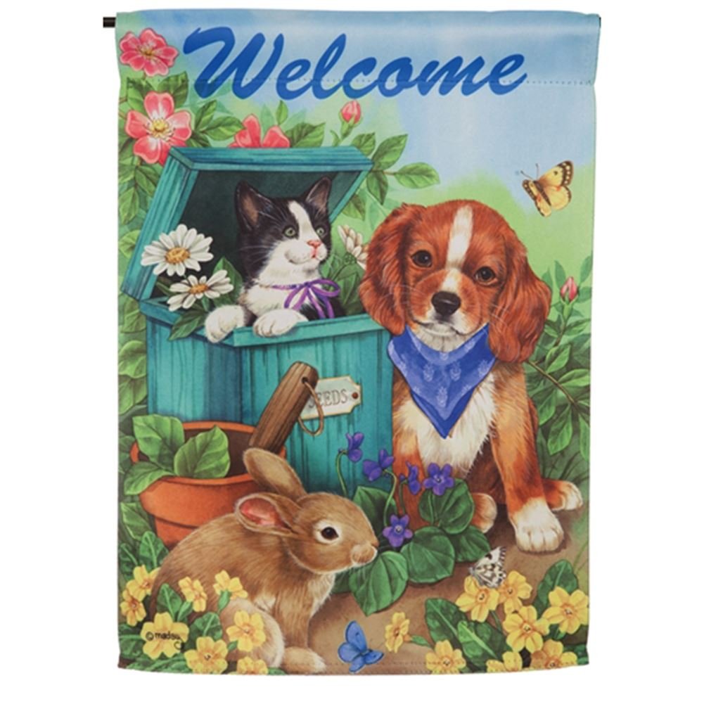 Welcome guests to your garden with the charming Precious Pets Garden Suede Flag. Featuring an adorable design of a puppy, kitten, and bunny surrounded by vibrant flowers, this flag adds a touch of whimsy and warmth to any outdoor space. Made from durable suede, the flag measures 18 inches by 12.5 inches, making it a perfect fit for any garden or porch. The vibrant colors and intricate details are designed to withstand the elements, ensuring long-lasting beauty. Ideal for pet lovers and garden enthusiasts alike, this flag is a delightful addition to your outdoor décor.