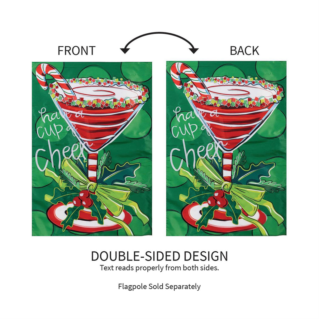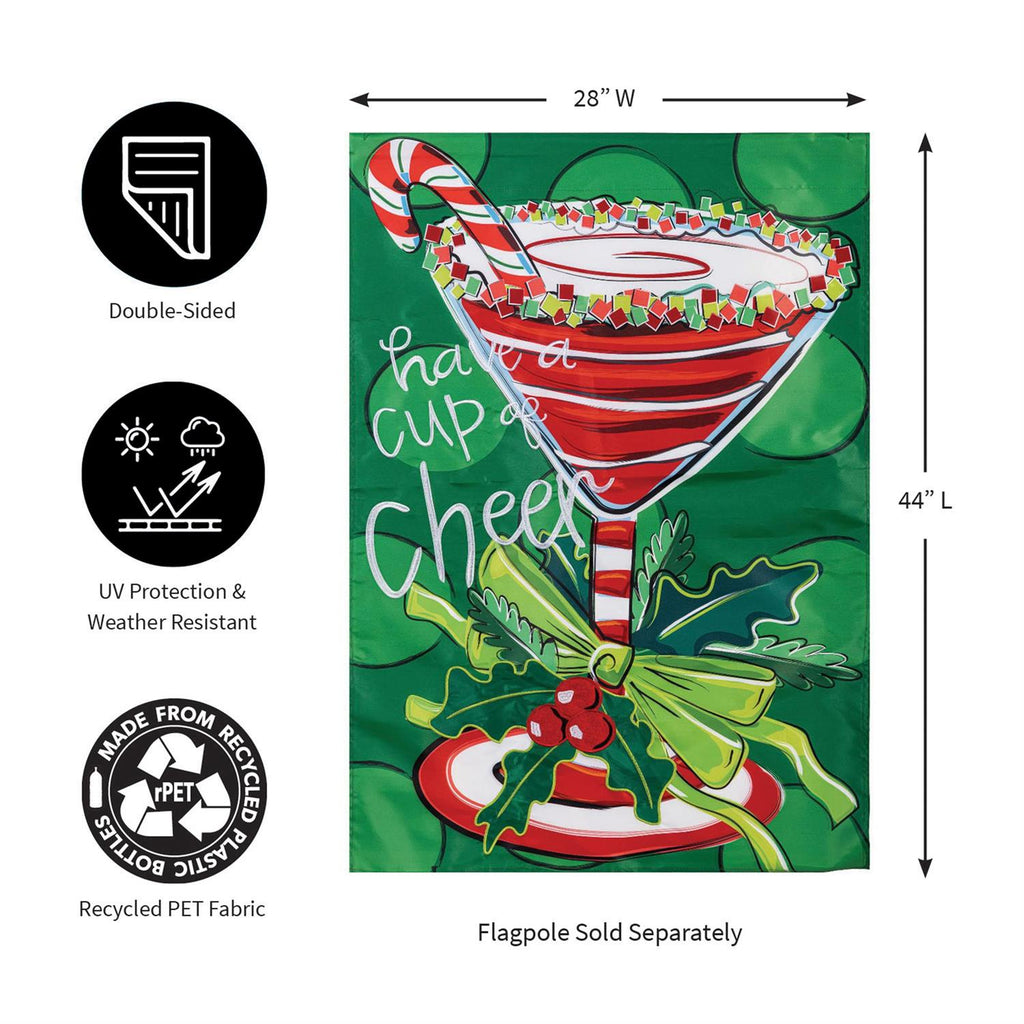 Add a festive touch to your home with the "Have A Cup Of Cheer" Applique House Flag. Measuring 28 inches in width and 44 inches in height, this vibrant flag features a whimsical holiday design with bright colors and charming details. Crafted from durable materials, it’s perfect for outdoor use, ensuring that it will spread joy throughout the holiday season. The applique design offers a textured, high-quality look that stands out in any yard. Ideal for Christmas enthusiasts looking to enhance their seasonal decor.