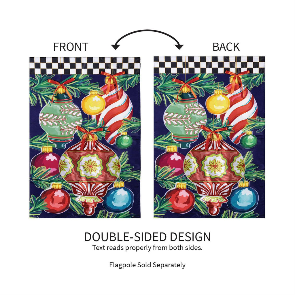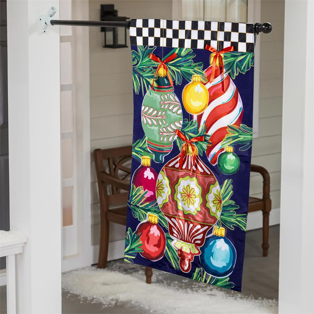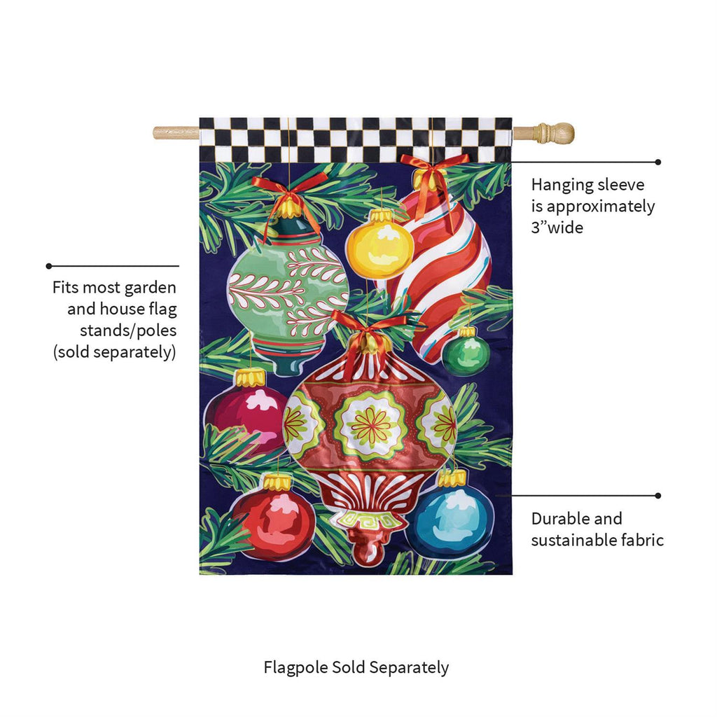 Celebrate the holiday season in style with the Happy Holidays Ornaments Applique House Flag. This vibrant flag, measuring 28 inches in width and 44 inches in height, features a delightful display of colorful ornaments, each intricately designed and set against a dark background. The applique style adds depth and texture, making the ornaments appear almost three-dimensional. Perfect for adding festive charm to your home, this flag is ideal for display in your front yard or garden, instantly enhancing your curb appeal during the holiday season.