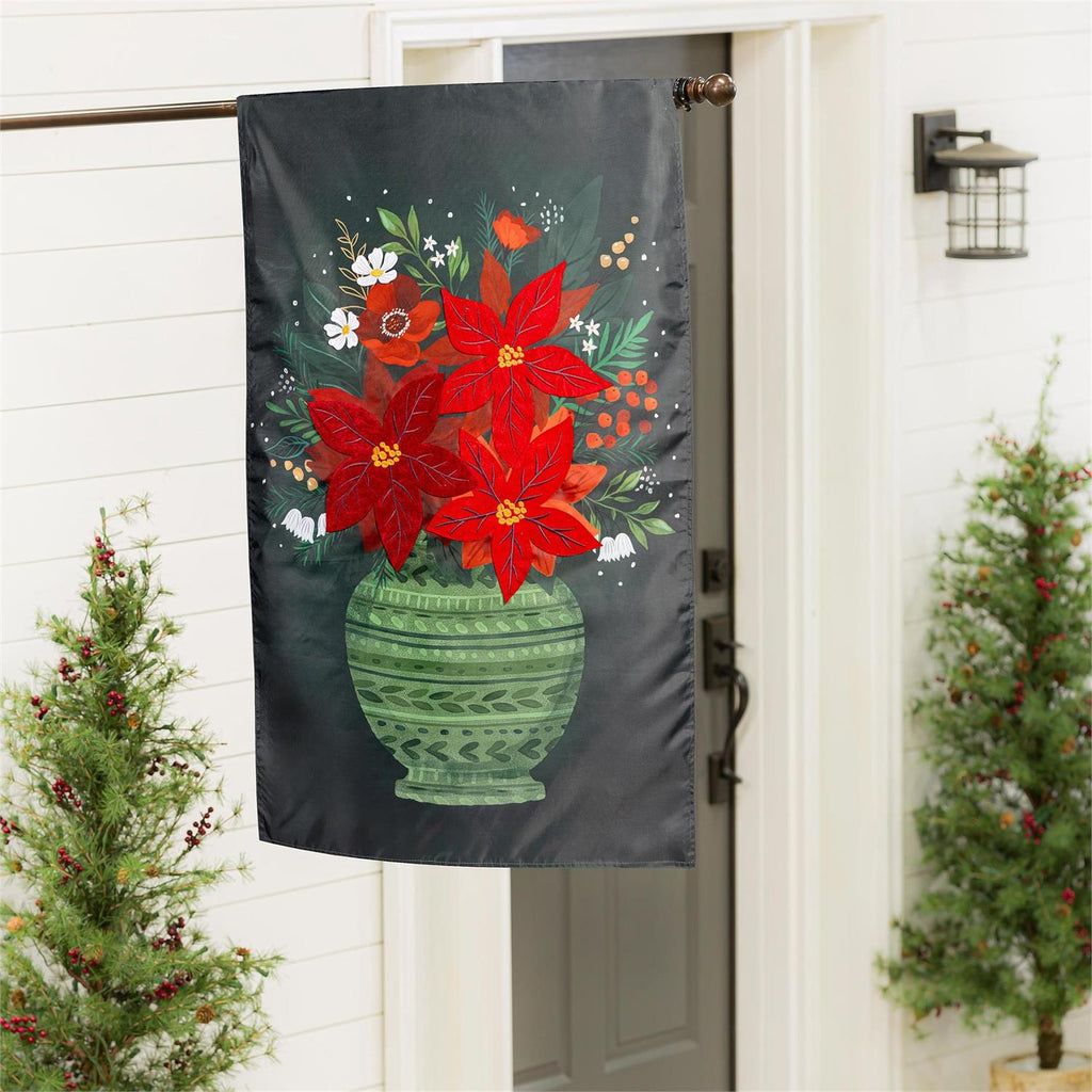 Enhance your home's holiday charm with the Floral Poinsettia Vase Applique House Flag. Measuring 28 inches in width and 44 inches in height, this flag features vibrant red poinsettias in an intricately designed green vase. Perfect for seasonal decoration, it adds a festive touch to any outdoor space. Crafted with durable materials, this applique flag withstands winter weather while maintaining its bright, welcoming appearance. Ideal for creating a warm, inviting entrance to your home during the holiday season.