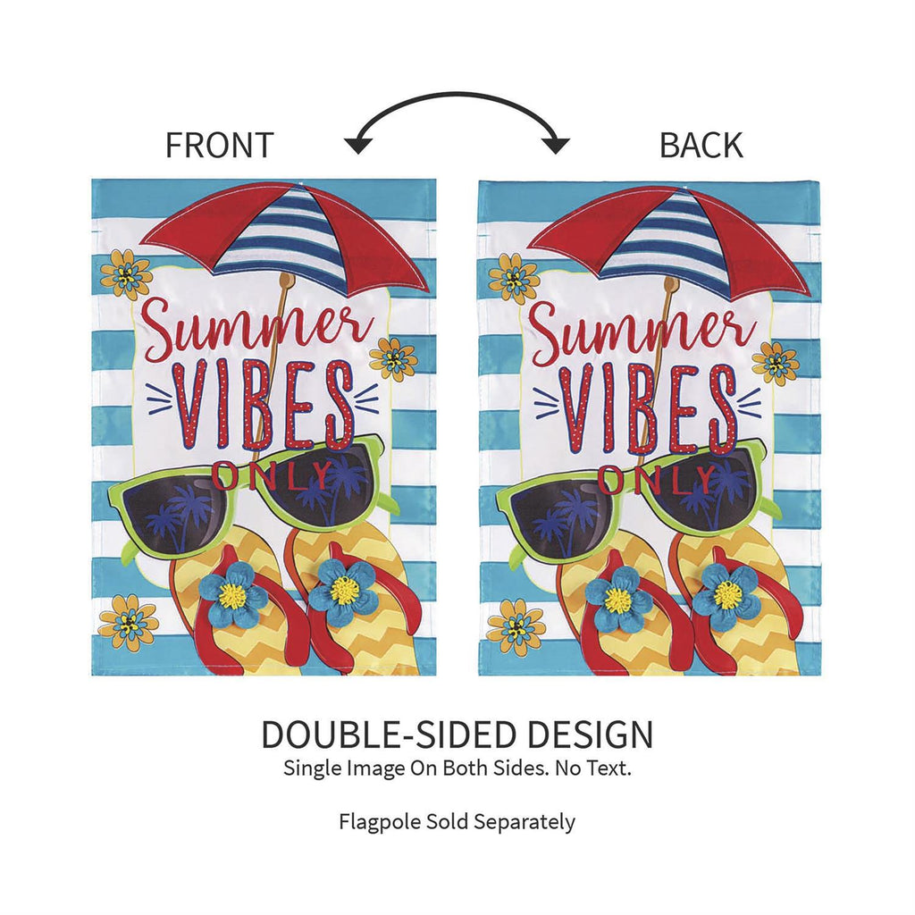 Add a refreshing touch to any yard or garden with this flag. With a sweet “Summer Vibes Only” message and tropical design, this flag welcomes friends and family to the home in style. Each Evergreen applique flag is carefully crafted from multiple layers of 310 denier nylon made from recycled plastic that can withstand a variety of weather conditions. We combine pieces of fade-resistant, strong fabric with tight, detailed stitching to create a dimensional mosaic effect. The soft yet heavyweight material illuminates beautifully in sunlight. Each flag features a sleeve that fits standard flagpoles or stands, sold separately. Due to the nature of the packaging, wrinkling may have occurred. Once item is unfolded and mounted on hardware, the creases will naturally fall out. Spot clean only. Never put in a dryer. When not in use, flags can be hung in a closet or placed in a storage container.