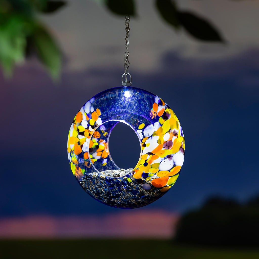 Blue Coastal Bird Feeder, Solar Art Glass Sky Swirl Feeder, 8"