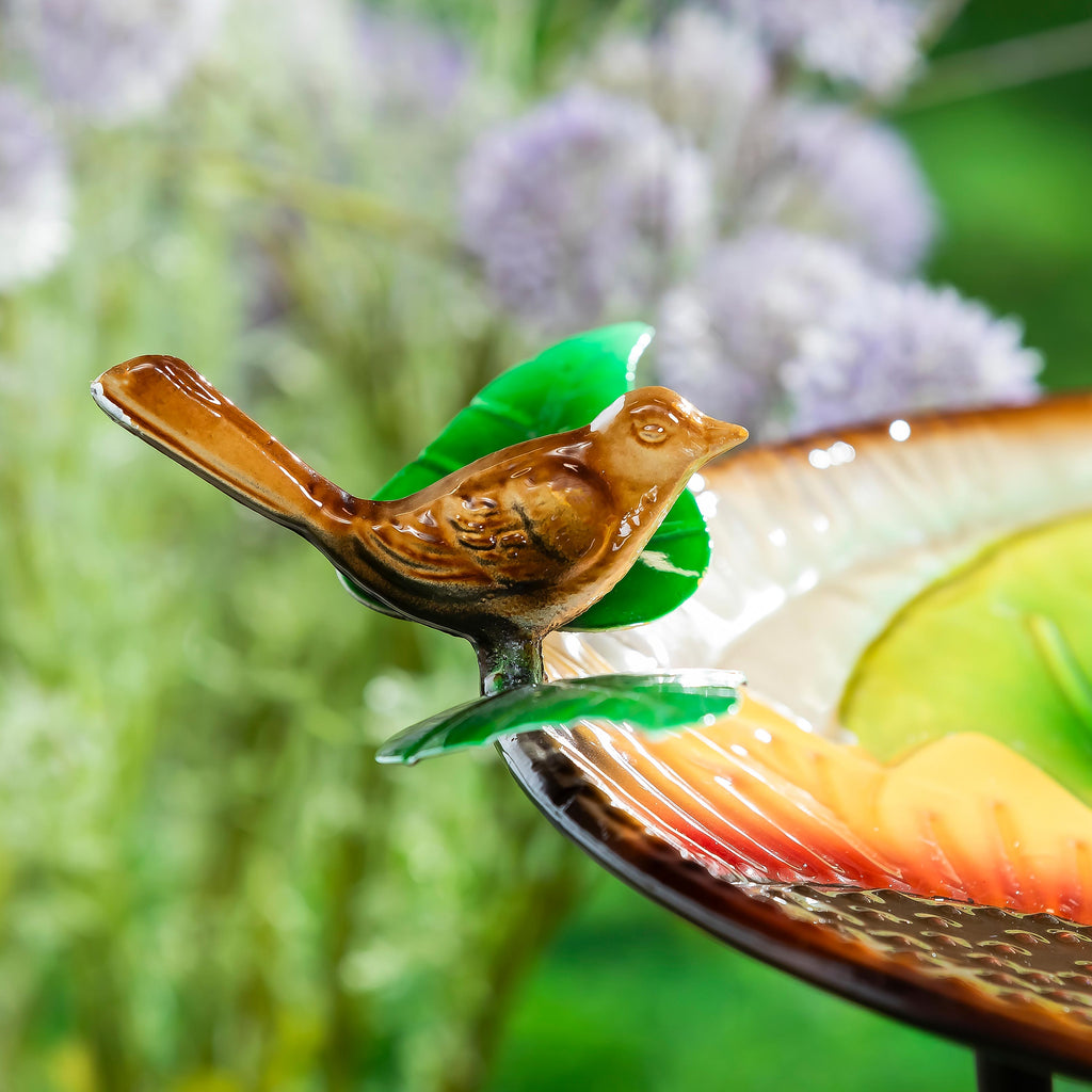 Bring a touch of nature to your garden with this charming birdbath featuring a vibrant sunflower and a playful ladybug design. Crafted from durable metal, it provides a delightful oasis for your feathered friends.