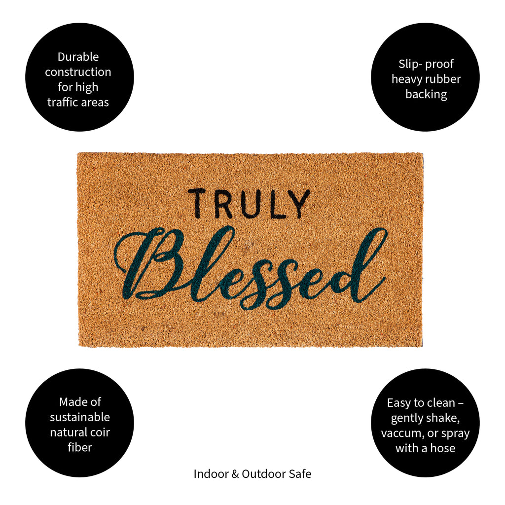 - Features a welcoming 'Truly Blessed' design in elegant script.