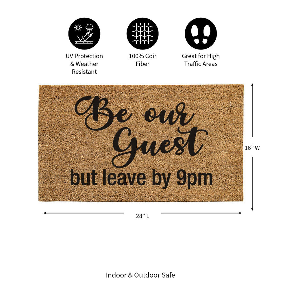 Welcome your guests with a touch of humor using this 'Be our guest but leave by 9pm' coir mat. Its durable material ensures long-lasting use for everyday entryways.
