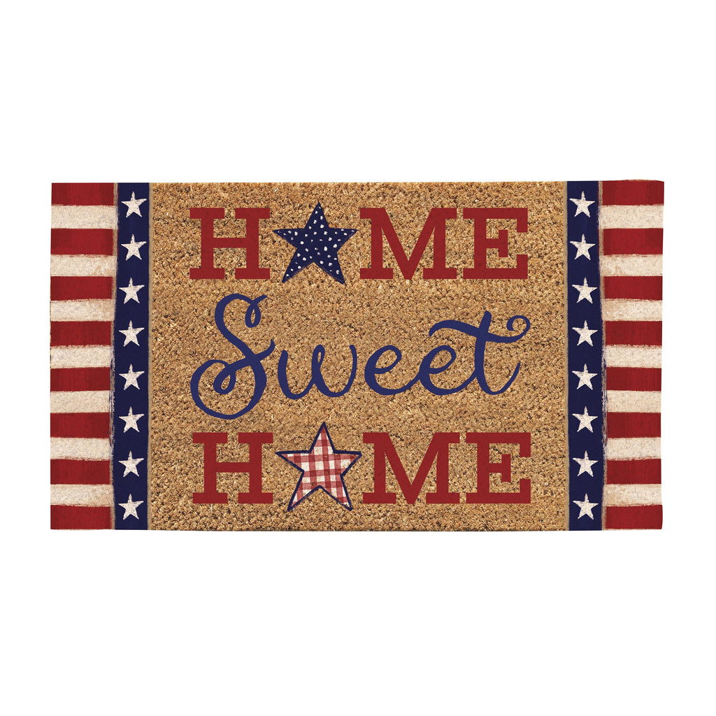 Welcome guests with a touch of patriotic charm using the Patriotic Home Sweet Home Coir Mat. Measuring 28 inches in length and 16 inches in width, this durable mat is perfect for any entryway. Made from natural coir fibers, it effectively traps dirt while adding a decorative element to your doorstep. The vibrant red, white, and blue design features stars and stripes, making it an ideal choice for celebrating national holidays or expressing your love for the country year-round. Its low profile of 0.59 inches ensures it fits seamlessly under most doors.