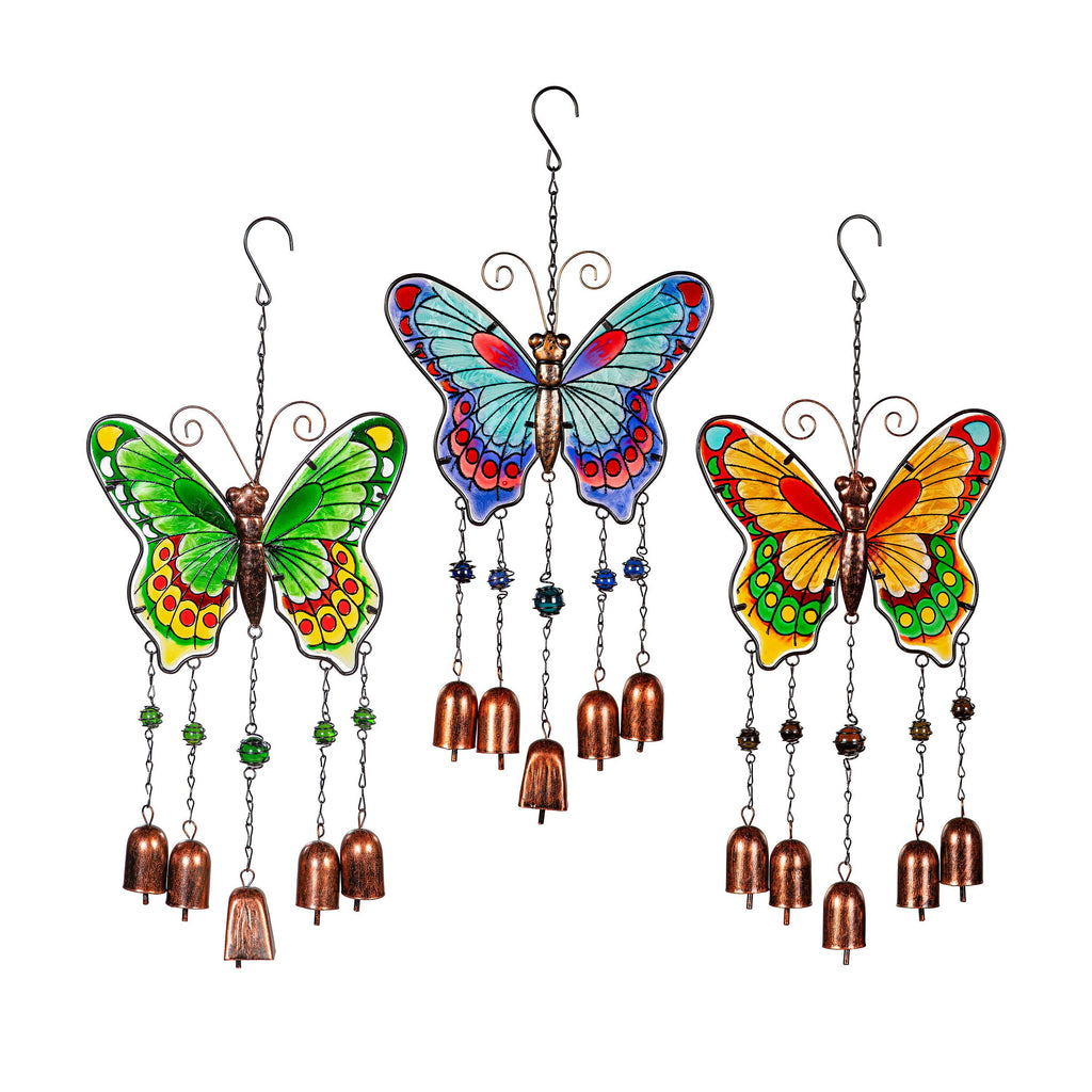 Pollinator Garden Wind Chime, Glass Butterfly Wind Chime with Bells, Asst of 3
