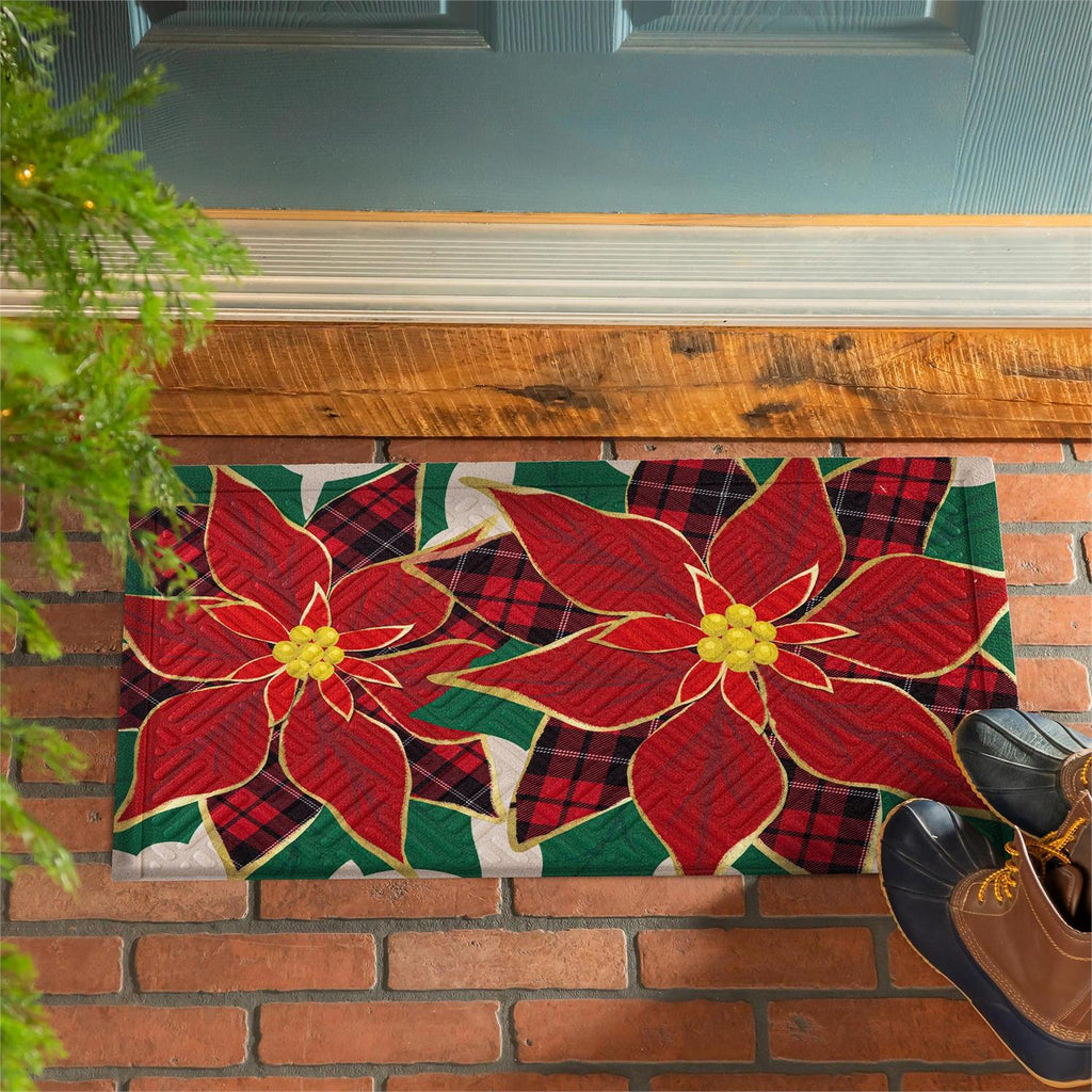Welcome guests in style with the Poinsettia Embossed Mat, perfect for adding a festive touch to your entryway. Measuring 30 inches in width and 18 inches in height, this mat features a vibrant poinsettia design with rich red and green hues, accented by a subtle plaid pattern. Made with a durable material, it provides a warm welcome while effectively trapping dirt and moisture. The embossed texture not only adds visual interest but also enhances its cleaning effectiveness. Ideal for the holiday season, this mat is both functional and decorative, making it a must-have for your home.