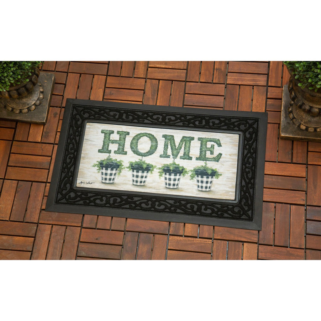 Welcome guests into your home with the charming Topiary Home Sassafras Switch Mat. This delightful mat measures 22 x 10 inches, making it the perfect size for any entryway. Crafted with a nature-inspired design, it features topiary art spelling out 'HOME' above a row of pots, adding a touch of greenery to your doorstep. The mat is both durable and decorative, ideal for seasonal use or year-round charm. Its slim profile ensures it fits neatly under most doors, making it a convenient and stylish addition to your home decor.