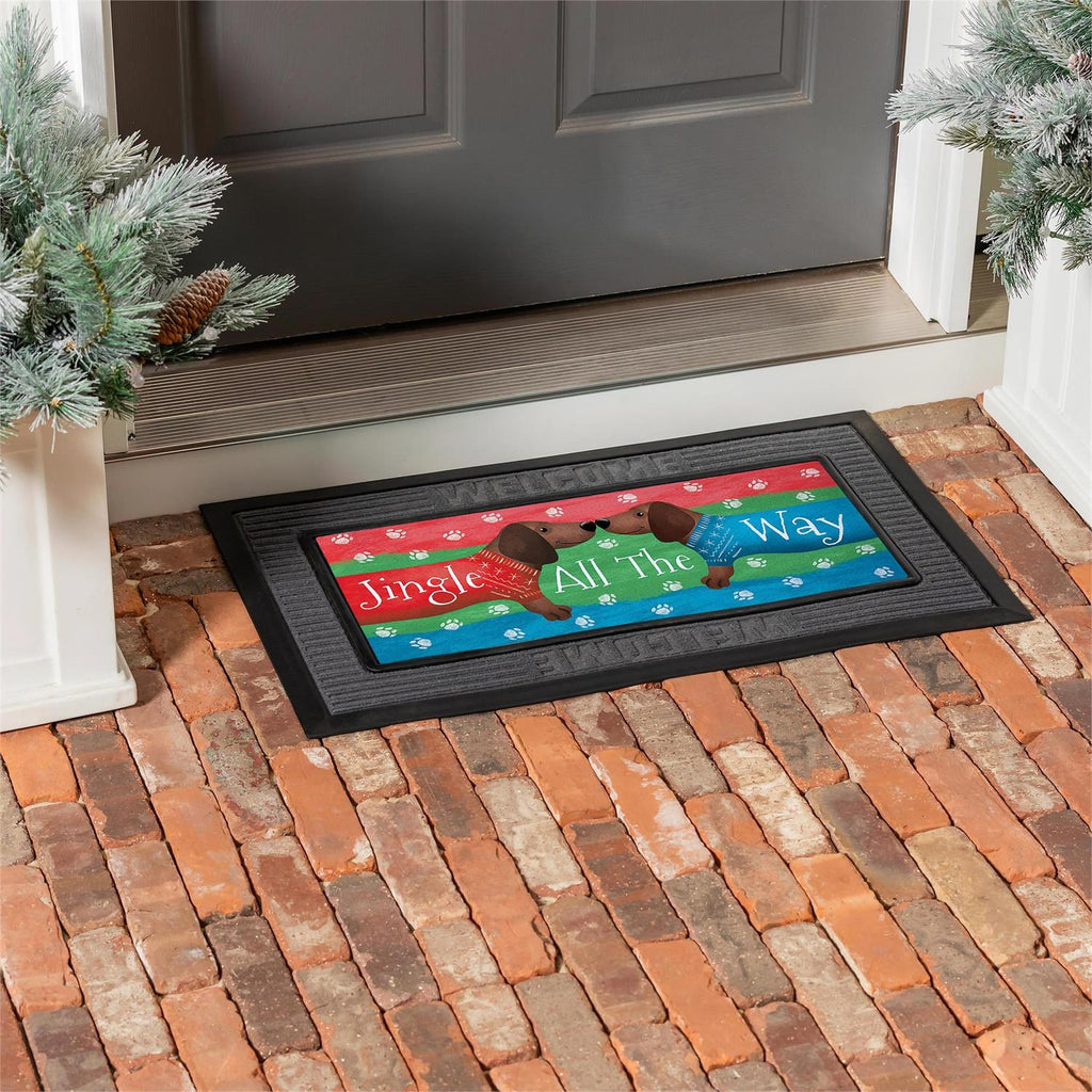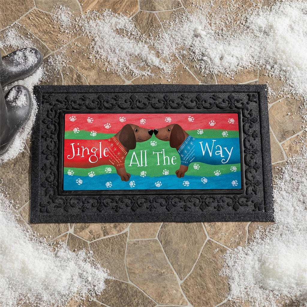 Bring festive charm to your doorstep with the Jingle All the Way Dachshunds Sassafras Mat. Perfect for the holiday season, this vibrant mat features two adorable dachshunds in cheerful sweaters against a colorful background. Designed to fit standard Sassafras bases, its durable construction ensures it withstands the winter weather while adding a playful touch to your entryway. Measuring 22 inches in width and 10 inches in height, this mat is a delightful way to welcome guests during the holidays.