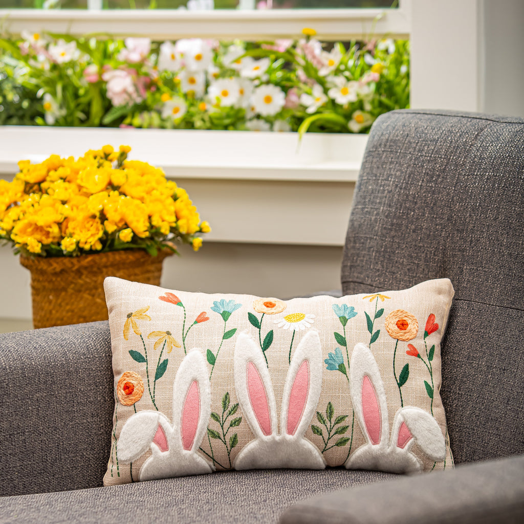 The Floral Bunny Lumbar Pillow features a charming design of bunnies and colorful flowers, perfect for adding a whimsical touch to any room. Ideal for both seasonal and everyday decor.