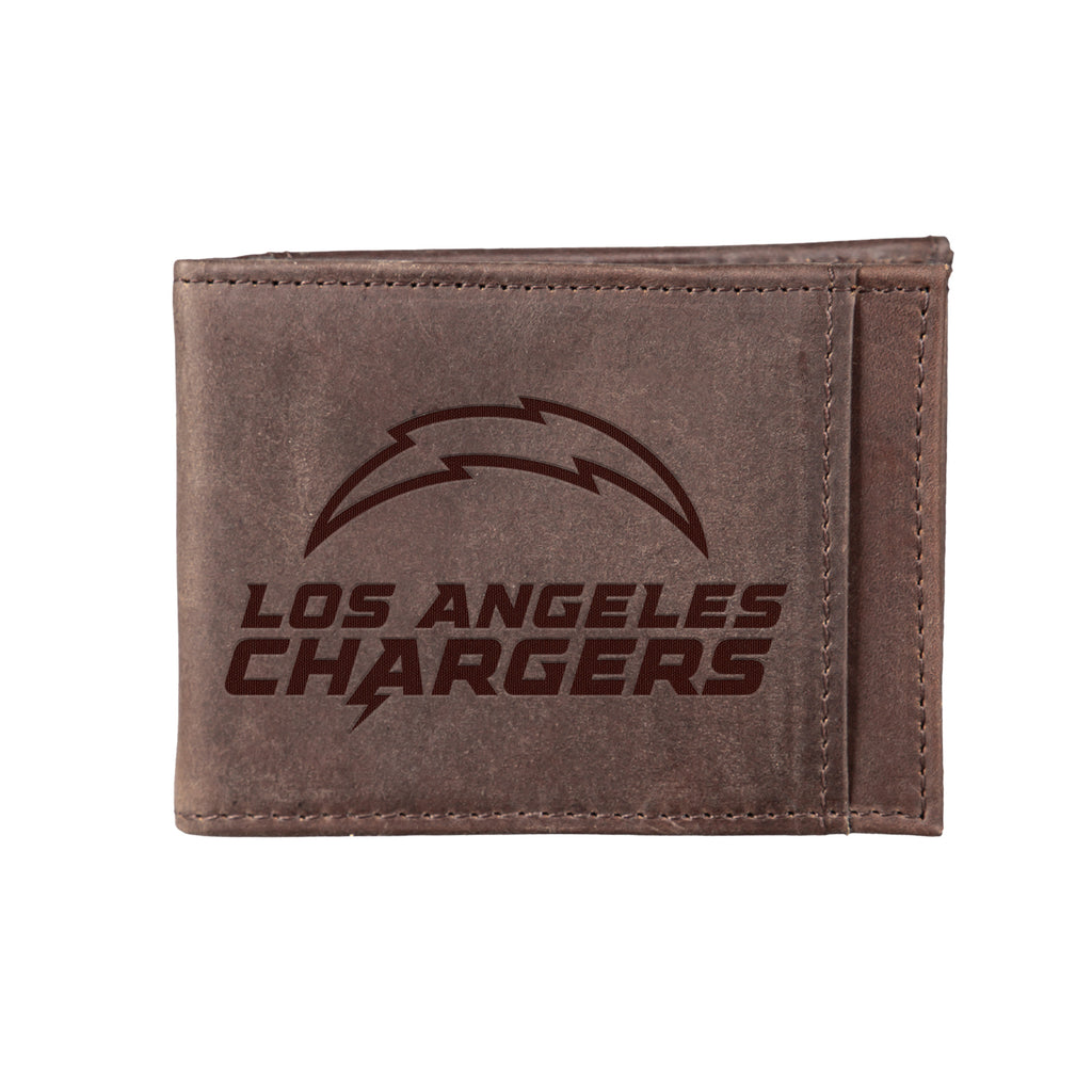 Show your team pride with the Los Angeles Chargers Front Pocket Wallet, featuring RFID blocking technology to protect your cards. Crafted in rich brown leather, this wallet combines style with functionality.