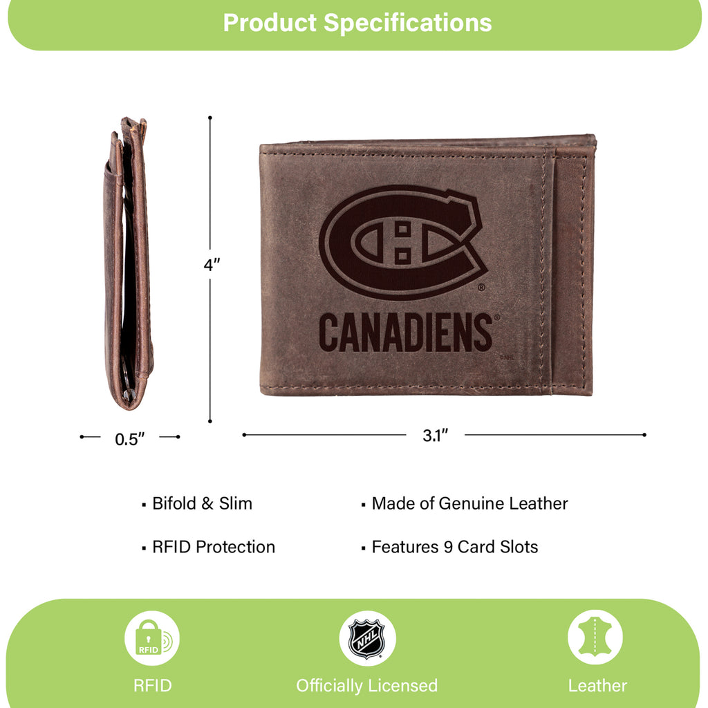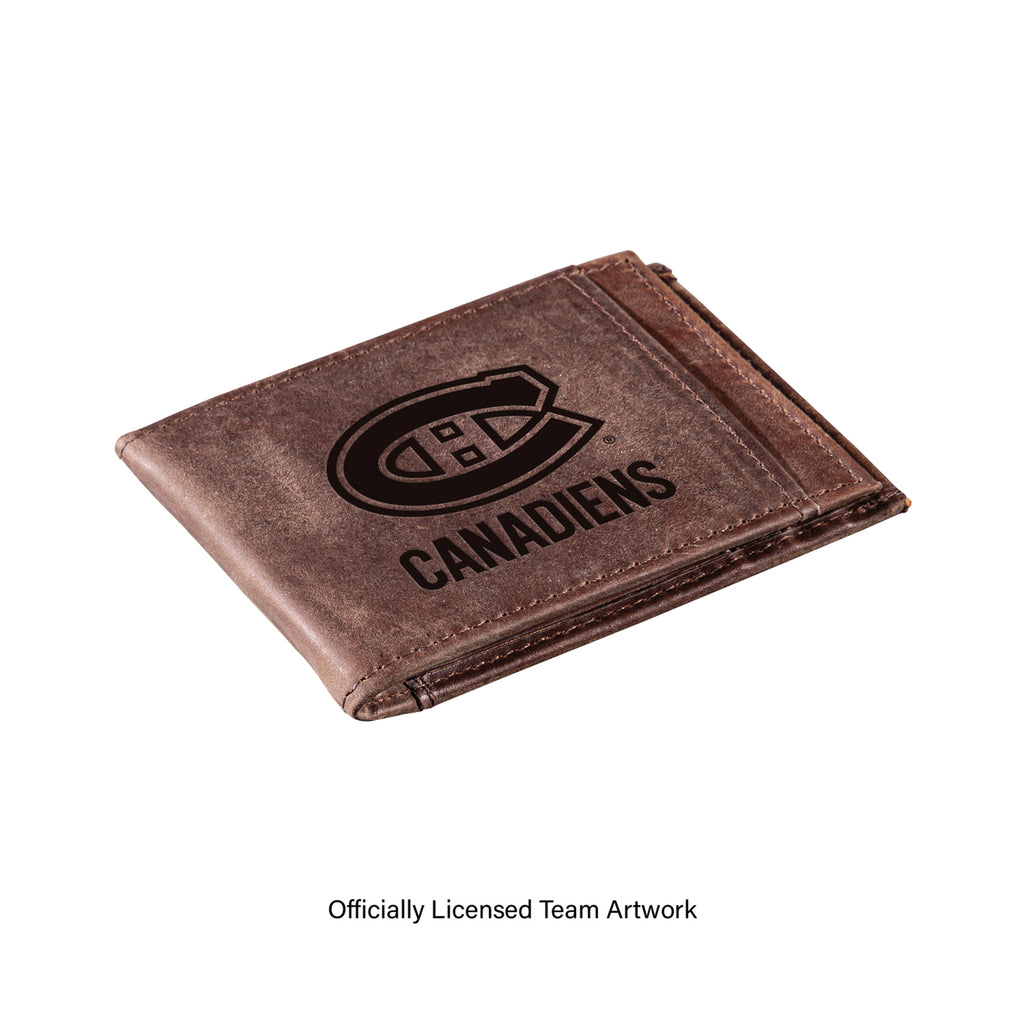Keep your essentials secure with this stylish Montreal Canadiens front pocket wallet featuring RFID blocking technology. Crafted in brown leather, it's a perfect gift for any hockey enthusiast.