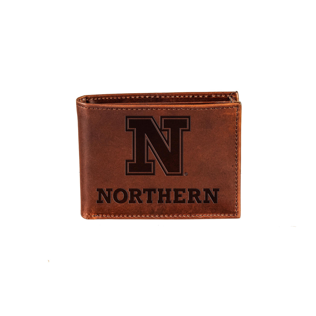 This brown bi-fold wallet is crafted from 100% genuine leather and features an embossed Northern State University logo, making it a stylish accessory for any fan.