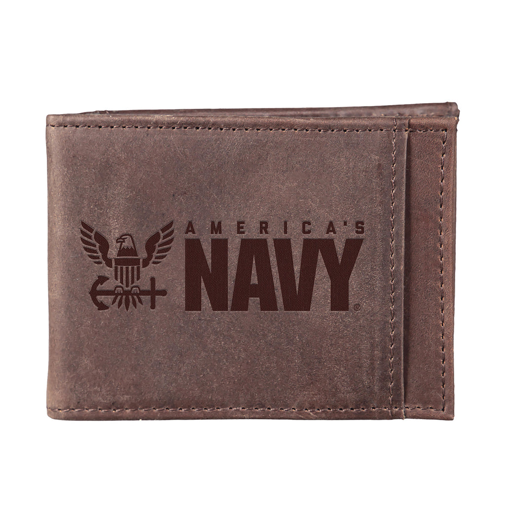 This US Navy brown front pocket wallet combines functionality with classic style, featuring RFID blocking technology and crafted from 100% genuine leather.