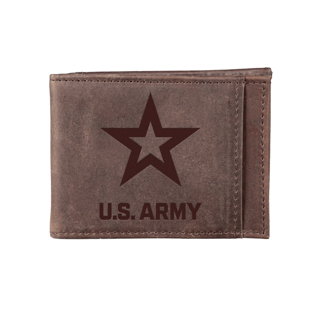 This US Army brown front pocket wallet offers a sleek design with RFID blocking technology, crafted from 100% genuine leather. It combines functionality and style, making it an ideal gift for military enthusiasts.