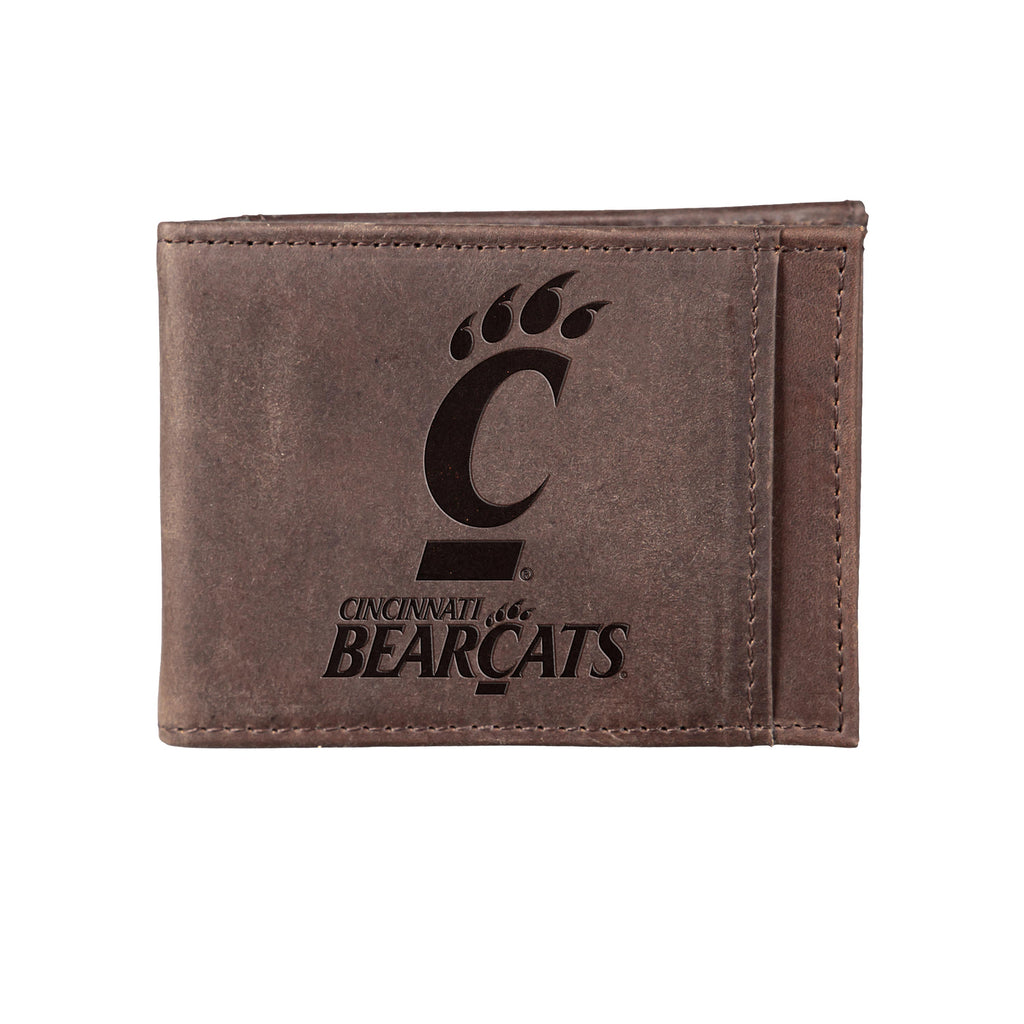 This brown front pocket wallet features RFID blocking technology and showcases the University of Cincinnati logo. It's a stylish and functional accessory for fans and alumni.