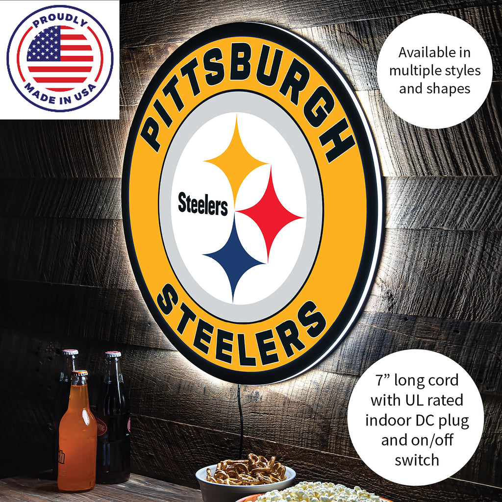 Illuminate your space with the Pittsburgh Steelers NFL Football Large Round Edgelite LED Decor, perfect for fans of the iconic team. This LED wall sign adds a vibrant touch to any room with its bold design and team logo.