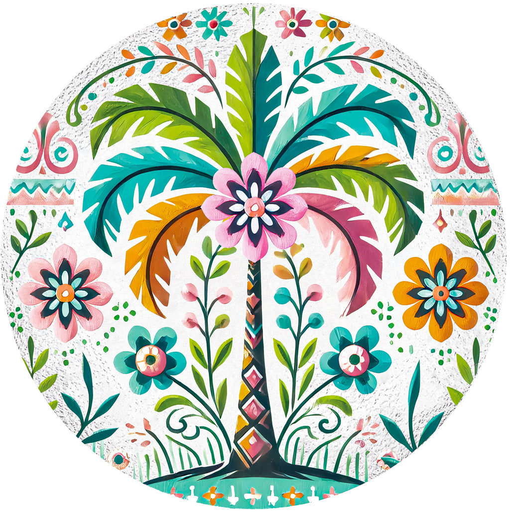Enhance your garden with the Palm Beach Birdbath, featuring a vibrant palm tree design in colorful folk art style. Crafted from glass, this birdbath adds a splash of tropical flair to any outdoor space.