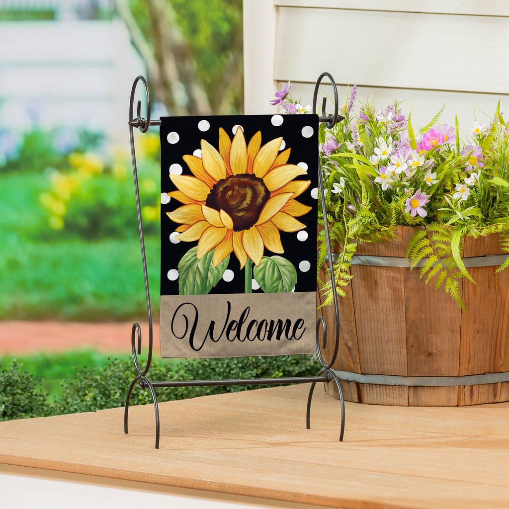 Add a touch of charm to your outdoor space with the Polka Dot Sunflower Burlap Garden Flag, featuring a vibrant sunflower design against a polka dot background.