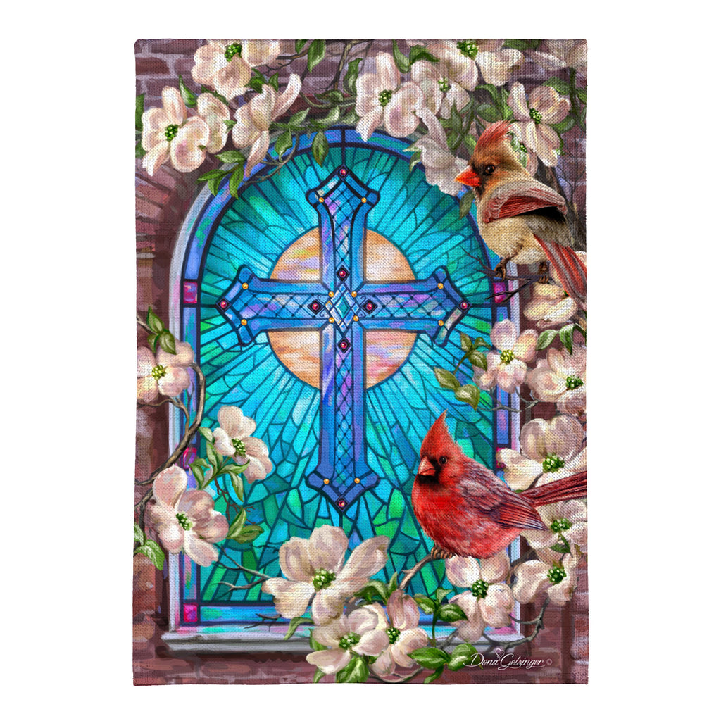Celebrate the serenity of Sunday mornings with this exquisite burlap house flag featuring a vibrant stained glass cross and cardinal design. Perfect for adding a touch of elegance to your outdoor spring decor.