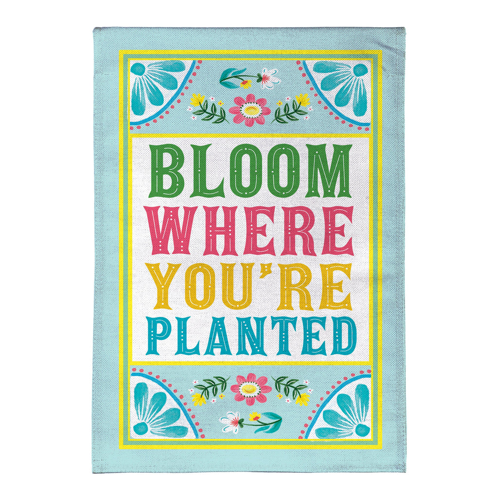Enhance your garden with the 'Bloom Where You're Planted' Burlap Garden Flag, perfect for adding a cheerful touch to your outdoor space. This vibrant flag is designed to inspire and uplift with its colorful and optimistic message.
