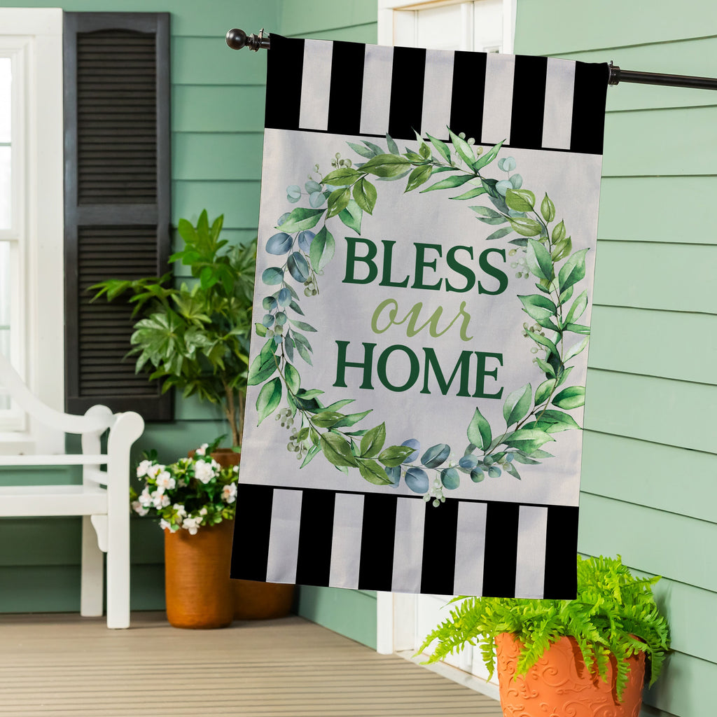Welcome guests to your home with the 'Bless Our Home' Burlap House Flag, featuring a charming leafy wreath design perfect for springtime. Crafted from durable burlap, this flag adds a touch of elegance to any outdoor space.