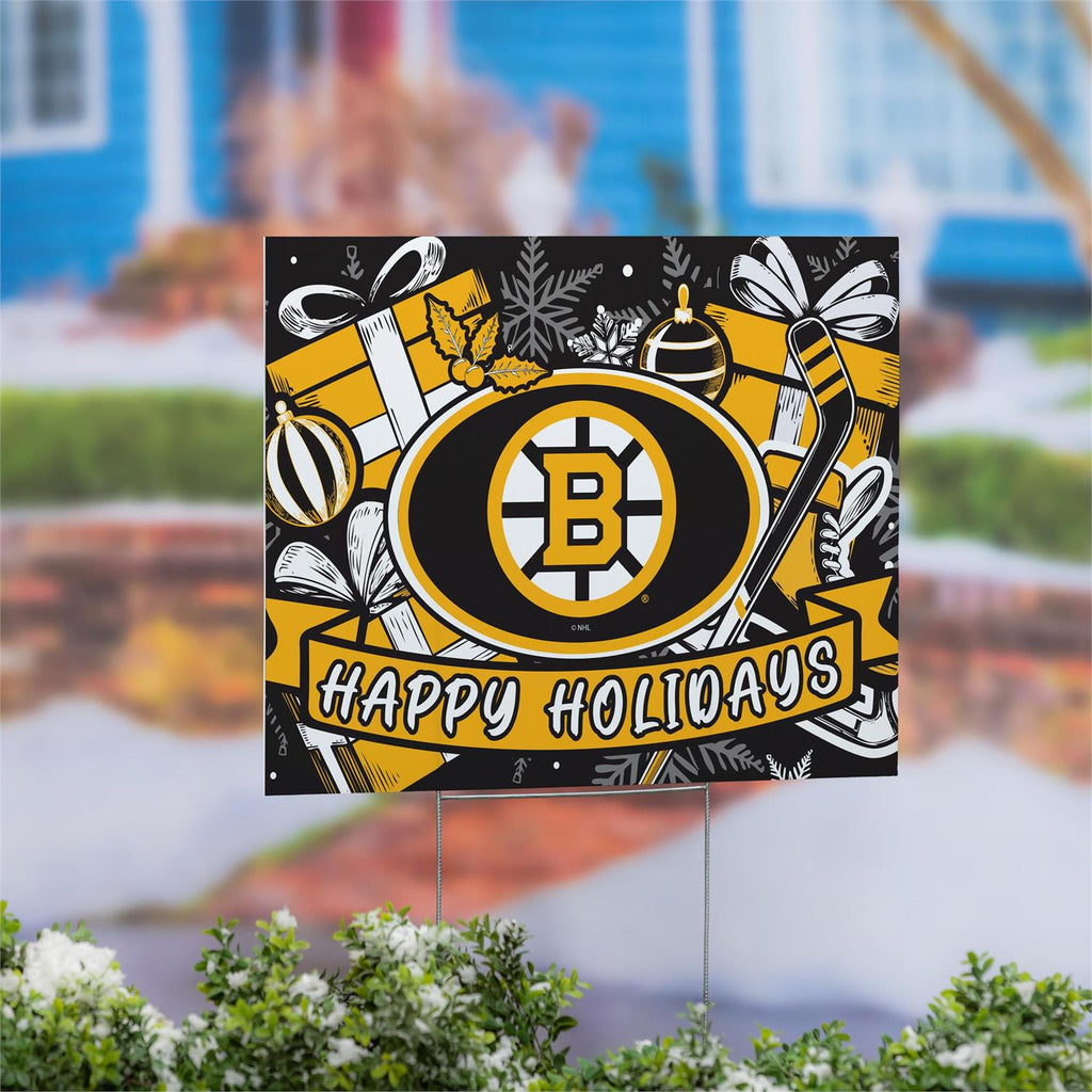 Celebrate the holiday season with your favorite team using this Boston Bruins yard sign. Perfect for any fan's garden, this sign features festive holiday graphics combined with the iconic team logo, making it a standout decoration. Constructed from durable materials, it withstands winter weather while adding a spirited touch to your outdoor space. Measuring 24 inches by 18 inches, it's the ideal size for front lawns or gardens. Show your team pride and holiday spirit with this eye-catching yard sign.
